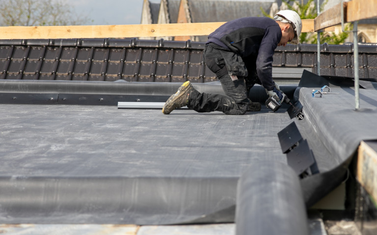 Het dak van 284m² is uitgevoerd met het BossCover Circular System. Bij dit systeem wordt de EPDM mechanisch verankerd en stevig vastgeklikt in de kim door middel van de gepatenteerde BossCover Certefix. Zelfs de dakrand wordt bevestigd met een gepatenteerd profiel, zonder lijm. Deze aanpak maakt het mogelijk om zowel het dak als de systeemonderdelen gemakkelijk te demonteren, waardoor het integrale dak onbeschadigd een tweede leven kan krijgen.