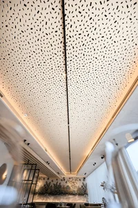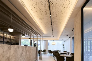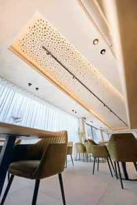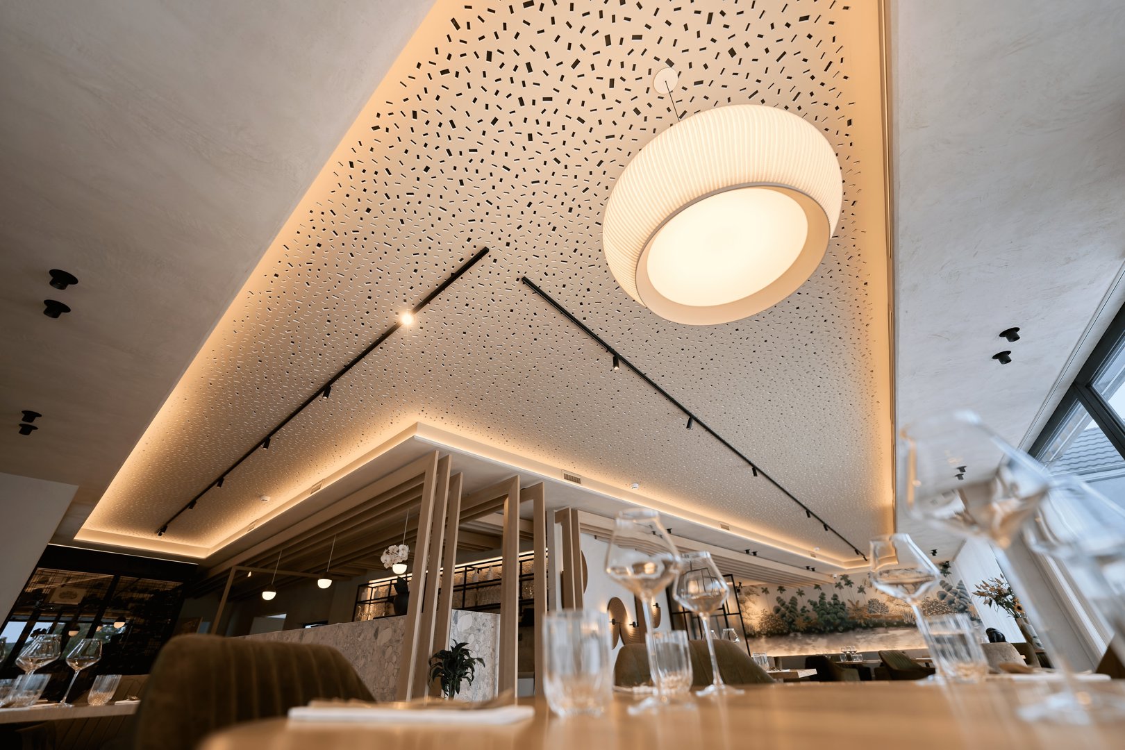 In de 42 m² grote ruimte van het restaurant werd gekozen voor Knauf SoundDesign Cleaneo-plafonds. De Aleatorio UFF RE Confetti-perforatie, met zijn speelse en moderne design, sluit perfect aan bij de uitstraling van het interieur. Het plafond, gecombineerd met indirecte verlichting en een verborgen airconditioningsysteem, creëert een rustgevende zen-sfeer, zelfs wanneer het restaurant volledig vol zit.