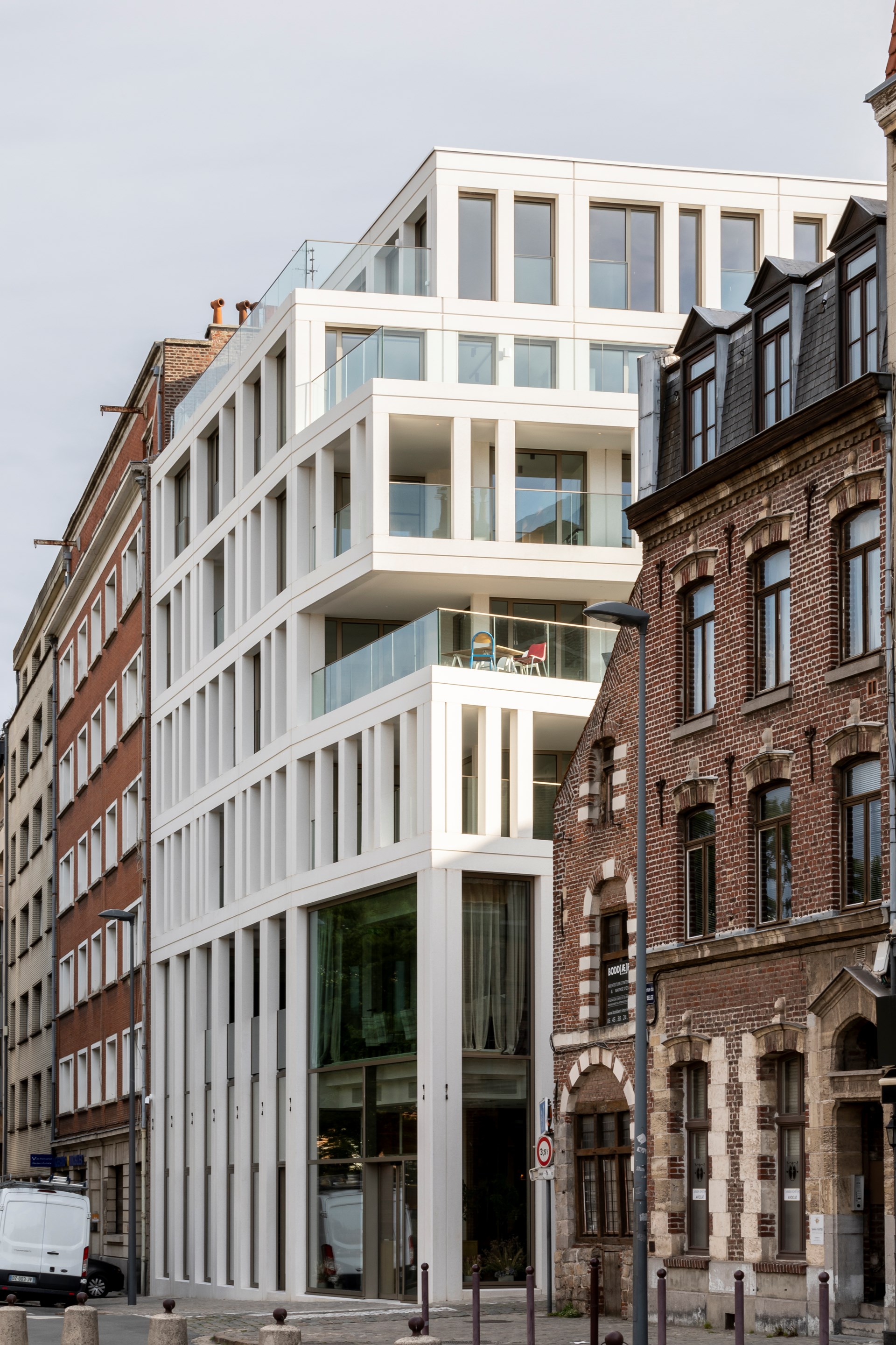 Deze beginproposities leidden tot een wit, strak gebouw met speelse façade met zes bouwlagen. De gevel heeft zijn karaktervolle uitstraling te danken aan de skeletstructuur, die door zijn verschillende hoogtes en getrapte volumes bij elke kijkrichting een andere dimensie lijkt te krijgen. Met de witte kleur kozen de architecten voor een gebouw dat zich mooi inpast in de omgeving, maar niet overschaduwd wordt door het patrimonium uit de buurt. Het cascade-effect is ook een antwoord op de complexe stedenbouwkundige eisen. Bovendien leidt de speelse volumetrie ertoe dat het gebouw een mooie sluitsteen vormt voor de huizenrij, door in beide straten mooi op de aanpalende gebouwen aan te sluiten. ‘Peuple Belge’ structureert de hoek van de straat met een lichte vormentaal, die tegelijk massa en materialiteit uitstraalt. Als materiaal werd daarbij gekozen voor wit architectonisch beton.