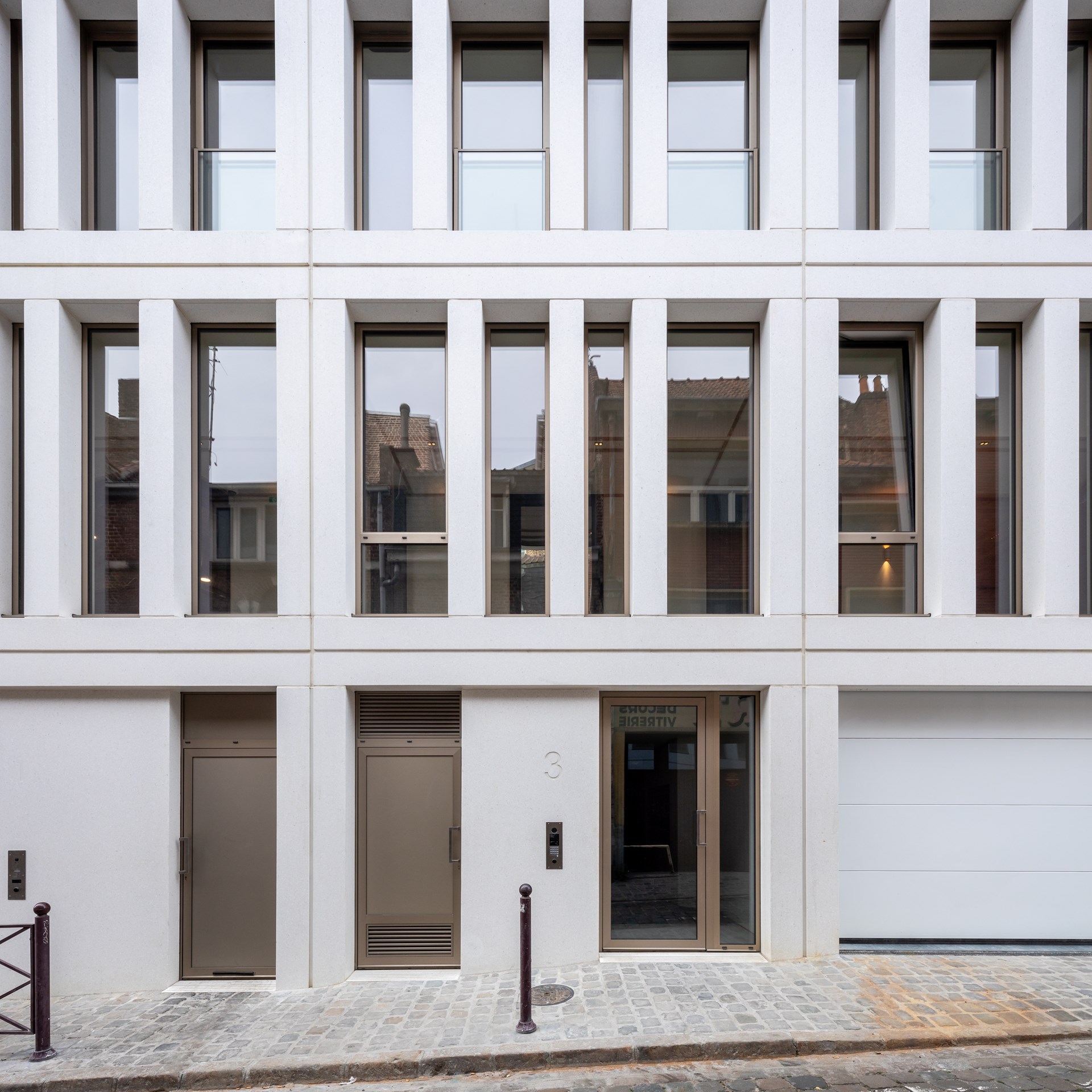 De façade is opgevat als een wit raster, waarvan de grootte van de travee zich aanpast aan de functies. Simon Ducreu: “Bredere openingen laten het restaurant vrij over de stad uitkijken. Vervolgens is voor de woningen een dichter raster gebruikt, om de privacy te waarborgen. Op de hogere verdiepingen laten grote openingen de bewoners genieten van het onbelemmerde uitzicht op de stad.”