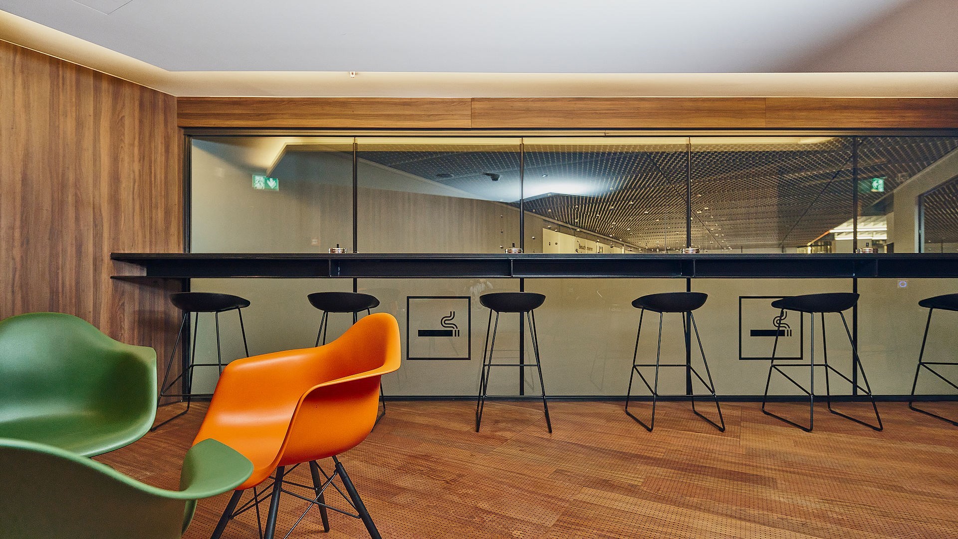 De rokerslounge werd ontworpen met dezelfde aandacht voor detail. Wandbekleding in een donkere houtlook die perfect past bij de kleur van de vloer en kleurrijk zitmeubilair nodigen bezoekers uit om te blijven hangen. Tegelijkertijd kunnen de bezoekers van de lounge altijd in de gaten houden wat er in de verkeersruimten tussen de winkels gebeurt. De rokerslounge bevindt zich in de Tivoli Galerie en heeft een lint van ramen die uitkijken op het interieur van het winkelcentrum.