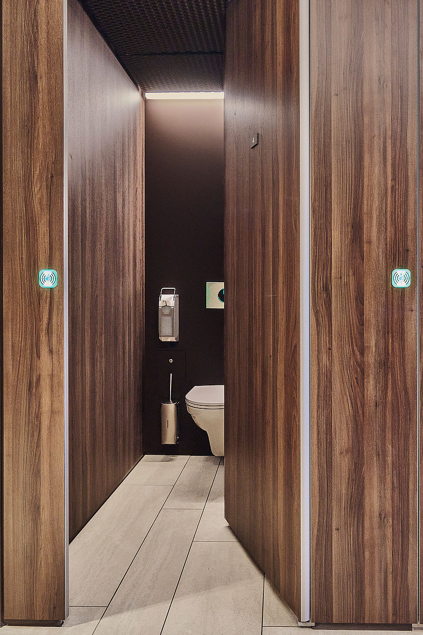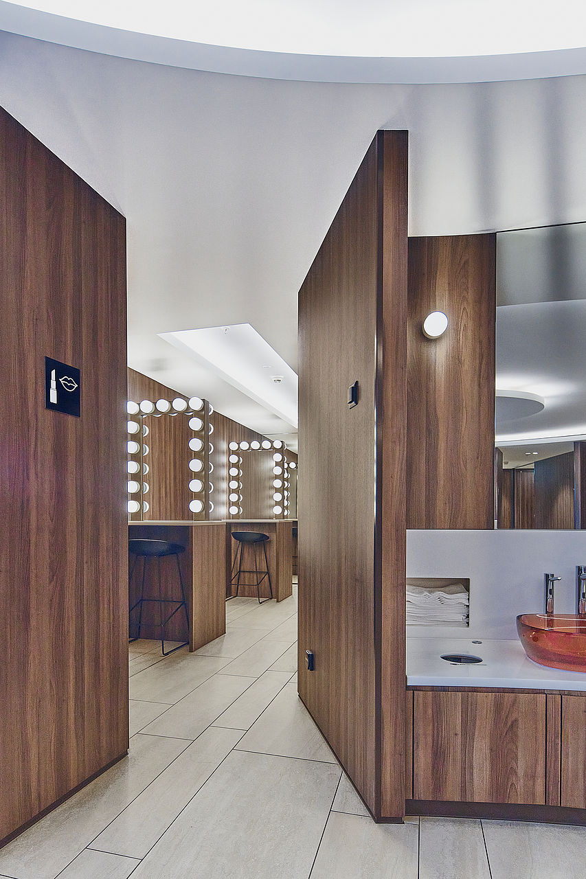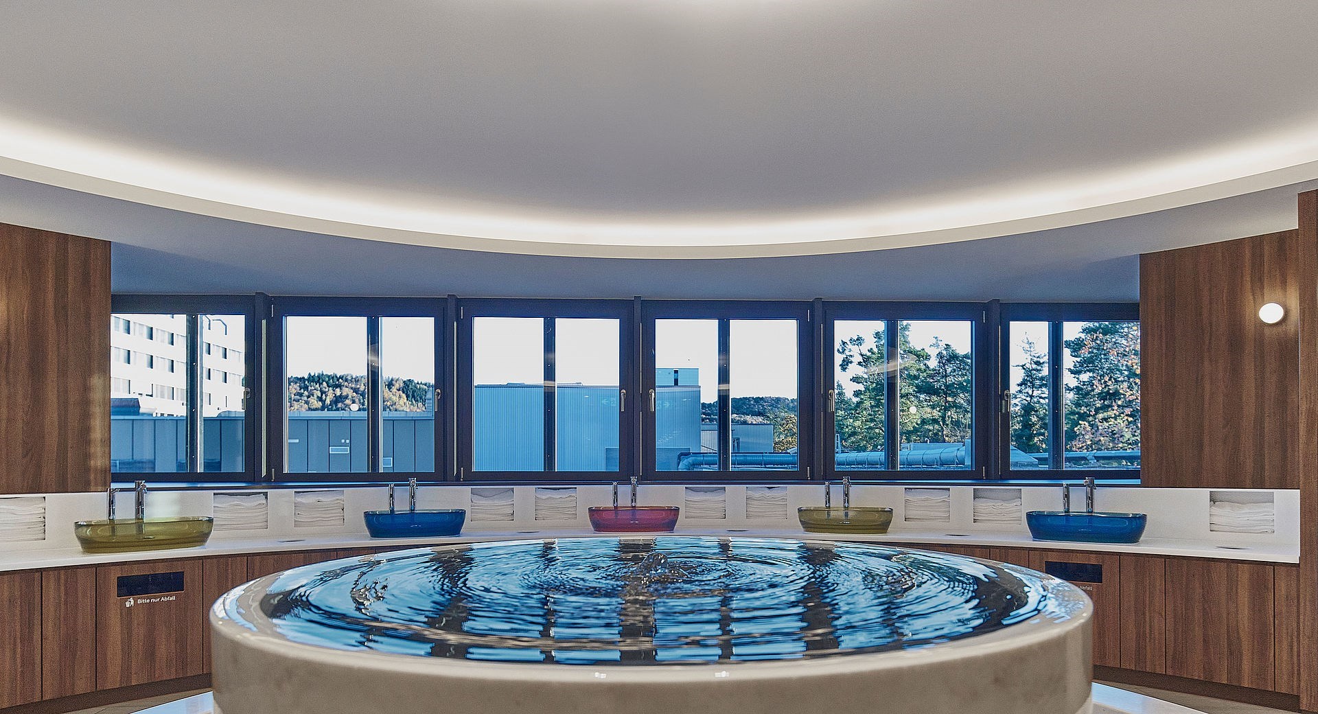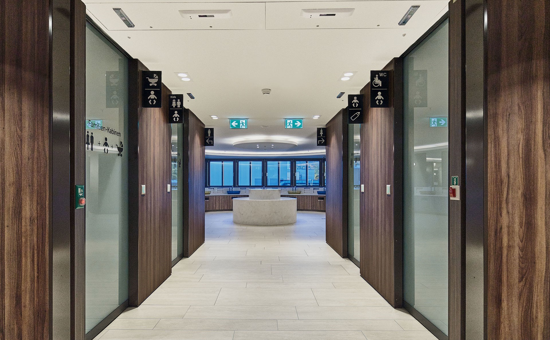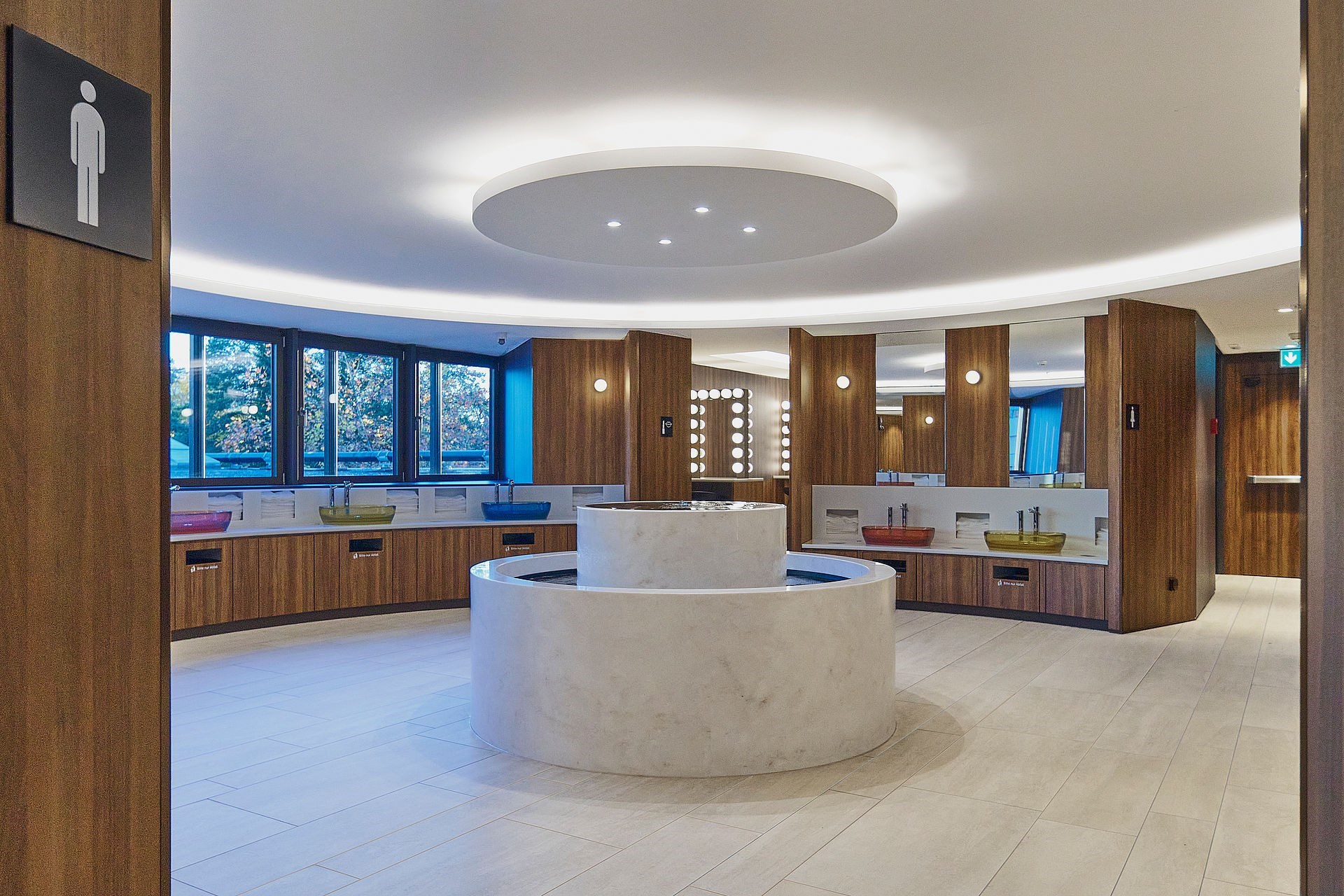 Het nieuwe ontwerp benadrukt de hoge standaard van het gebouw met zijn royale ruimte-indeling en vormentaal alsmede hoogwaardige materialen en sfeervolle verlichting. Tegelijkertijd werd door scheidingssystemen en intelligente structurering voor een hoge mate van functionaliteit gezorgd: Kleed- of familiekamers, een ruimte met make-upspiegels en een waterinstallatie in het midden van de ronde wasruimte zorgen voor een uitnodigende sfeer. Tegelijkertijd zorgen de eveneens robuuste en onderhoudsvriendelijke oppervlakken van de gebruikte houtmaterialen ervoor, dat de nieuwe sanitaire voorzieningen gemakkelijk schoon te houden en duurzaam aantrekkelijk blijven.