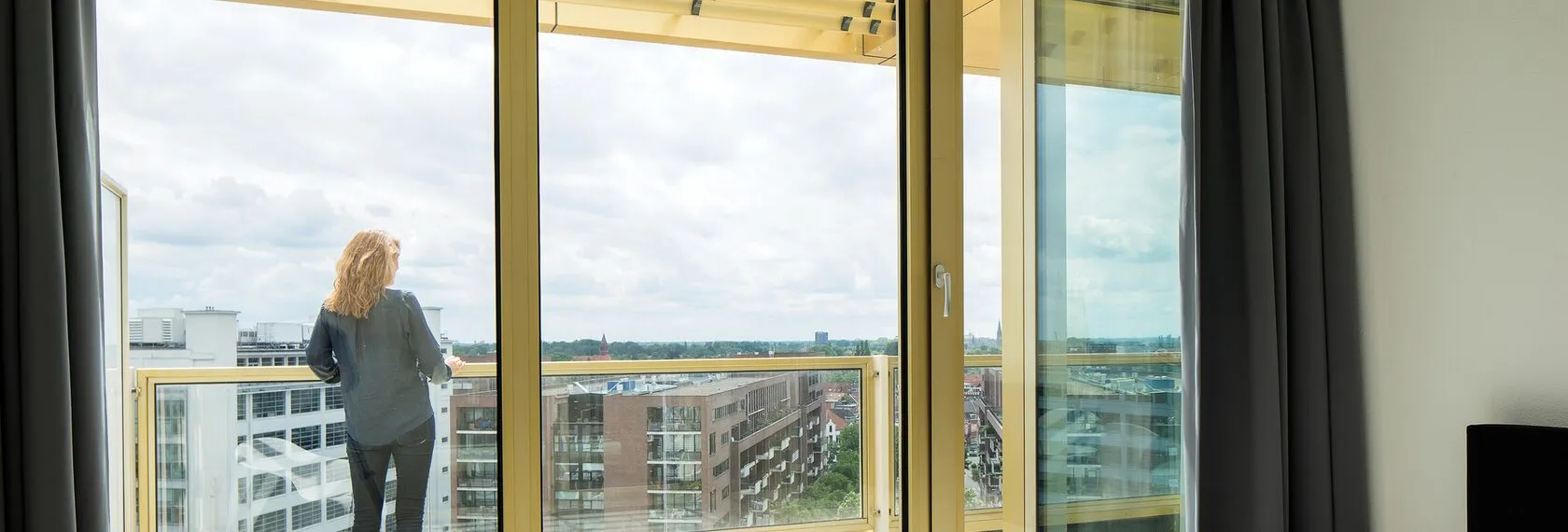 Het architectenbureau benaderde Reynaers om de bijzondere ramen te leveren. Mark van Rosmalen, projectadviseur architecten bij Reynaers: “Verticaal schuivende raamsystemen (CP130-EVS) van deze afmetingen zijn geen gemeengoed in de woningbouw. Toch hadden we de expertise in huis. We leveren deze kozijnen namelijk voor cruiseschepen die bijvoorbeeld op de Rijn varen. Op verzoek van de gevelbouwer en architect hebben we het schuifsysteem doorontwikkeld zodat het aan de strenge eisen van dit project voldoet. Daarbij zijn de ramen liggend geplaatst en voorzien van elektrische aandrijving. De combinatie van de hoogte van het gebouw én de afmetingen en het gewicht van de ramen waren bepalend voor de afmetingen van de profielen.” Deze zijn 76 mm diep en bestand tegen een hoge windbelasting. Diederen: “Ze ogen daardoor zowel robuust als spannend. Kijk je namelijk loodrecht op het gebouw dan is de gevel glad, maar vanuit een hoek gezien geven de ramen de façade extra dieptewerking.”