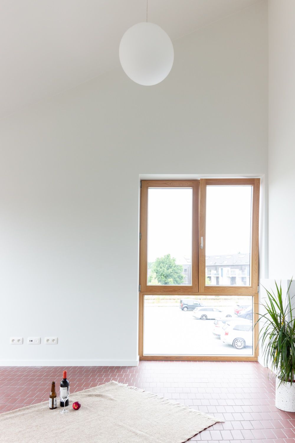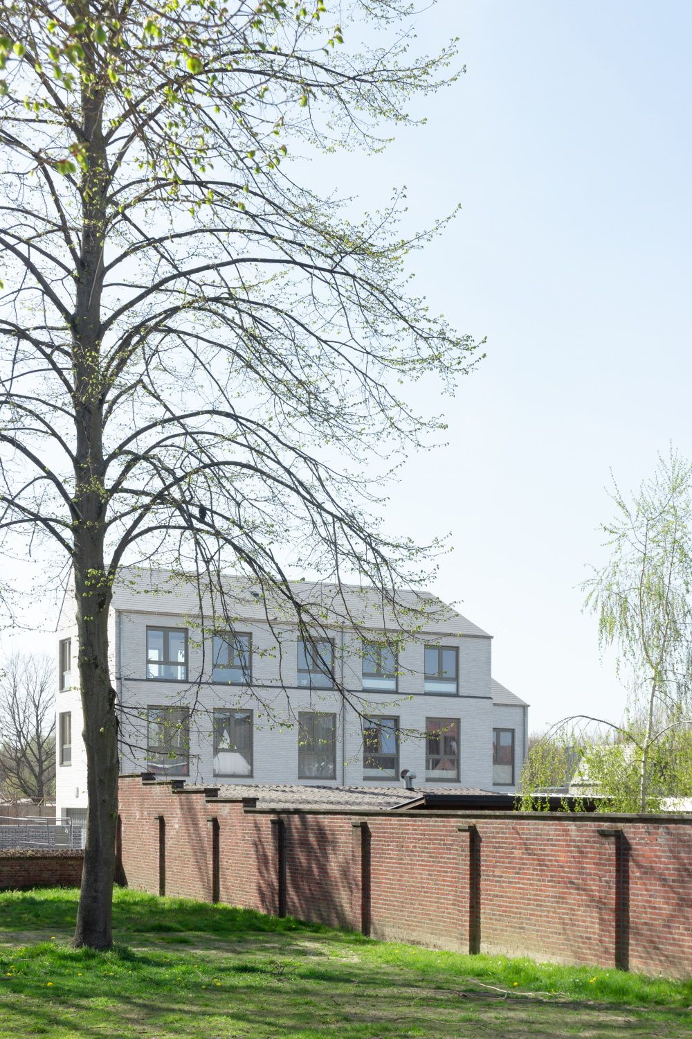 De voorgevel van het gebouw heeft een baksteenplint die doorloopt in de lage tuinmuur met een toegangspoortje. Daarachter ligt een kleine koer met een fietsenstalling en een trap die naar het eerste niveau leidt. Boven kom je binnen in een gemeenschappelijke vestibule waar drie voordeuren toegang bieden tot de verschillende appartementen. “Daarmee vieren we het thuiskomen”, zegt de architect. “Je staat niet abrupt met de voordeur op de stoep. De overgang gebeurt geleidelijk en in de tussenruimte is er plaats om elkaar te ontmoeten.”