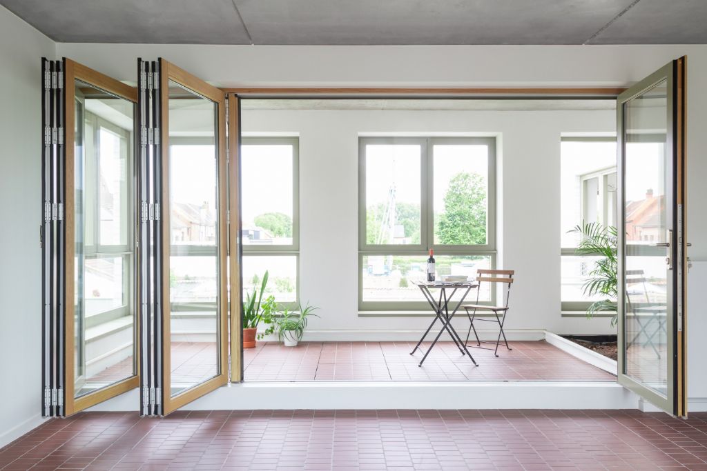 Vanuit de appartementen zijn de inpandige terrassen telkens toegankelijk via grote plooiramen die volledig open kunnen en de vloertegels van het interieur lopen naadloos over tot op het terras. Zo creëerde het architectenbureau een soort van wintertuinen die altijd nauw in verbinding staan met de leefruimtes van de appartementen. “De grens tussen binnen en buiten kan vervagen,” vertelt Ooms, “en na zo’n coronajaar weten we hoe waardevol dat kan zijn.”