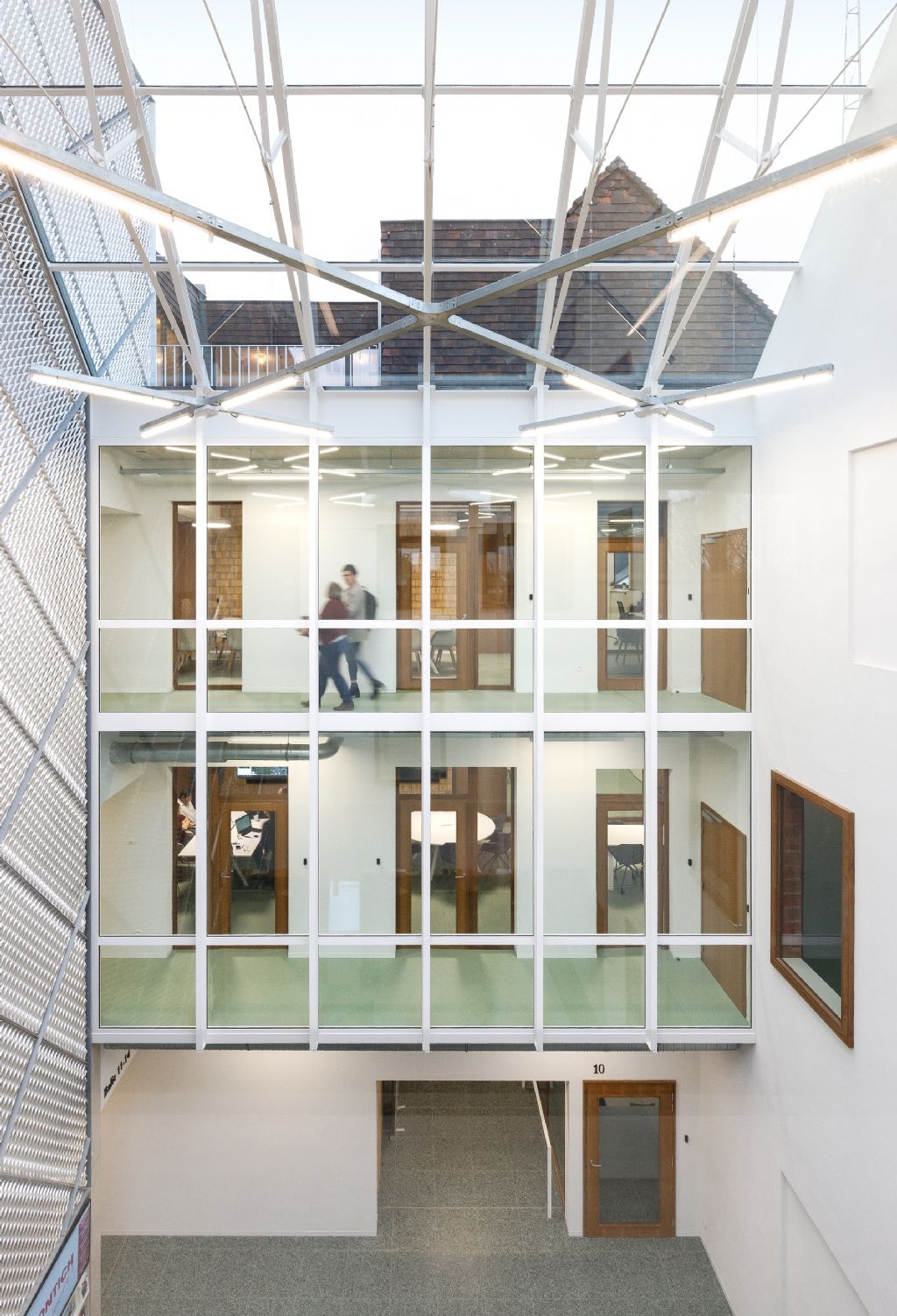 De patio en de U-vorm van het bestaande gebouw werden overkapt en gesloten tot een compacter geheel. Hierdoor is er niet alleen minder verliesoppervlakte, het daglicht dringt nu ook door tot diep in het gebouw. Dat is een enorm surplus op de duurzaamheidswaarde van dit project. De helderheid van het plan laat ook toe om in één oogopslag het hele gebouw te begrijpen.