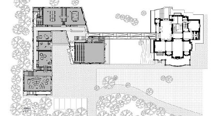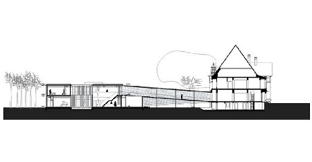 De publieke delen van het paviljoen worden gekoppeld aan deze van de bestaande villa. De as van inkom, traphal, wachtzaal in de villa wordt doorgetrokken in het nieuwe gebouw. Zo wordt de villa met haar “bel-etage” door een “schaar-brug” verbonden met het paviljoen: men moet slechts een half verdiep stijgen of dalen. ‘Paviljoen’ en ‘Villa’ worden één, met elk een hun eigen relatie ten opzichte van de omgeving. Tussen het oude en nieuwe gebouw hebben de ontwerpers een buitenpodium voorzien. Het omgevende groen van het park zal deel uitmaken van het geheel. Maar ook het kunstpaviljoen zelf krijgt een groen tintje. Het dak zal uitgevoerd worden als groendak. Het zal bedekt worden met mos en planten die niet groter worden dan 15 cm. Zo’n dak heeft geen onderhoud nodig maar het buffert wel heel wat water en het zorgt ook voor extra isolatie.
