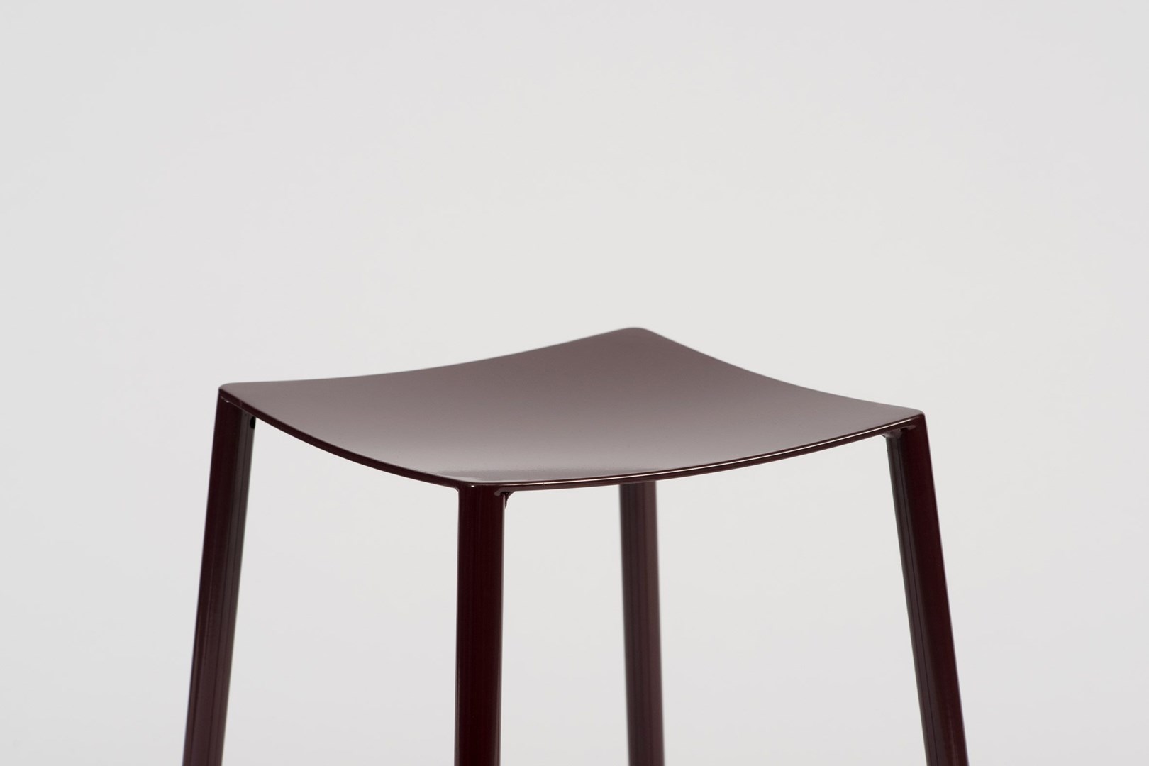De Living Objects stool is verkrijgbaar in de kleuren puur wit, ivoor en wijnrood, maar ook in gegalvaniseerd staal. In dat geval wordt de kruk behandeld met een dun laagje zink en krijgt ze een patina die er op geen enkele kruk hetzelfde zal uitzien. Door de kruk te gebruiken, laat je bovendien zelf sporen na in het patina waardoor het product steeds unieker wordt.