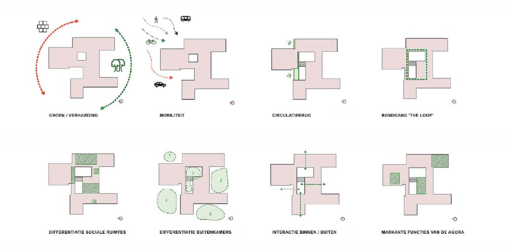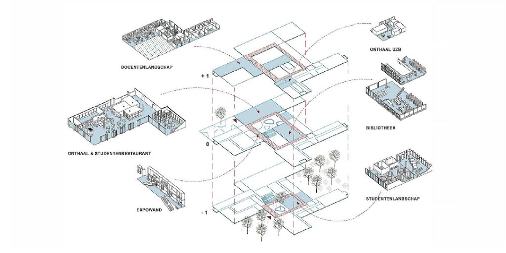 Een nieuwe rondgang 'the loop' structureert de interne circulatie. De toegevoegde circulatiebrug ontsluit en geeft leesbaarheid op alle verdiepingen. ‘The loop’ wordt geanimeerd door ontmoetingsplaatsen zoals een studentenrestaurant, een auditorium, een bibliotheek en een co-working zone. Deze ruimtes worden verspreid over het campusgebouw om onderlinge kruisbestuiving tussen studenten, docenten en werknemers aan te moedigen. Ze staan ook maximaal in contact met aangrenzende buitenruimtes die in het nieuwe ontwerpvoorstel elk over hun eigen gebruik en sfeer beschikken.