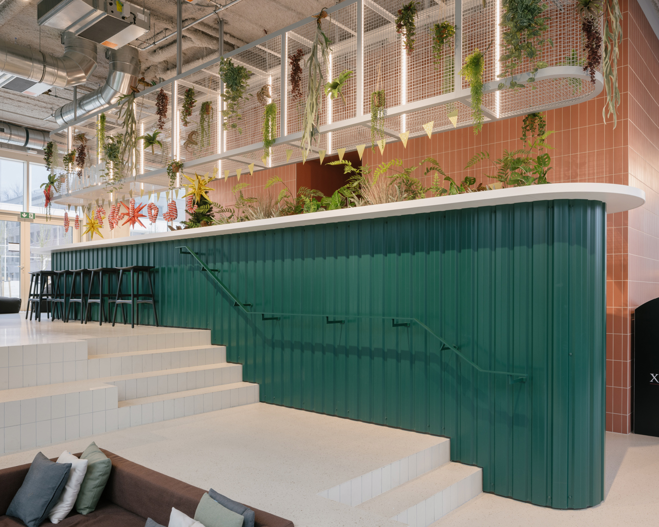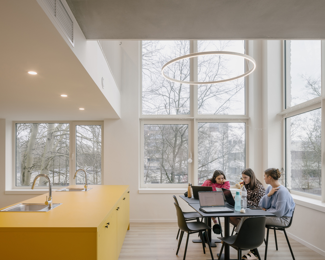 De studentenkamers onderscheiden zich door geïntegreerd meubilair in tinten groen, wat de brutalistische erfenis van de campus een speelse toets geeft. In de gemeenschappelijke ruimtes wordt ontmoeting aangemoedigd door de open indeling en strategische zichtlijnen. Licht, kleur en tactiliteit versterken de ruimtelijke ervaring zonder overdaad. De combinatie van robuustheid en subtiliteit maakt van de gebouwen meer dan louter studentenverblijven: ze vormen plekken waar wonen, leren en ontspannen samenvallen.