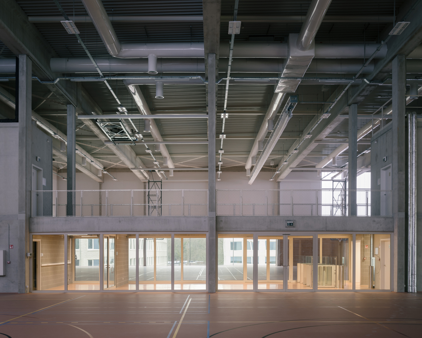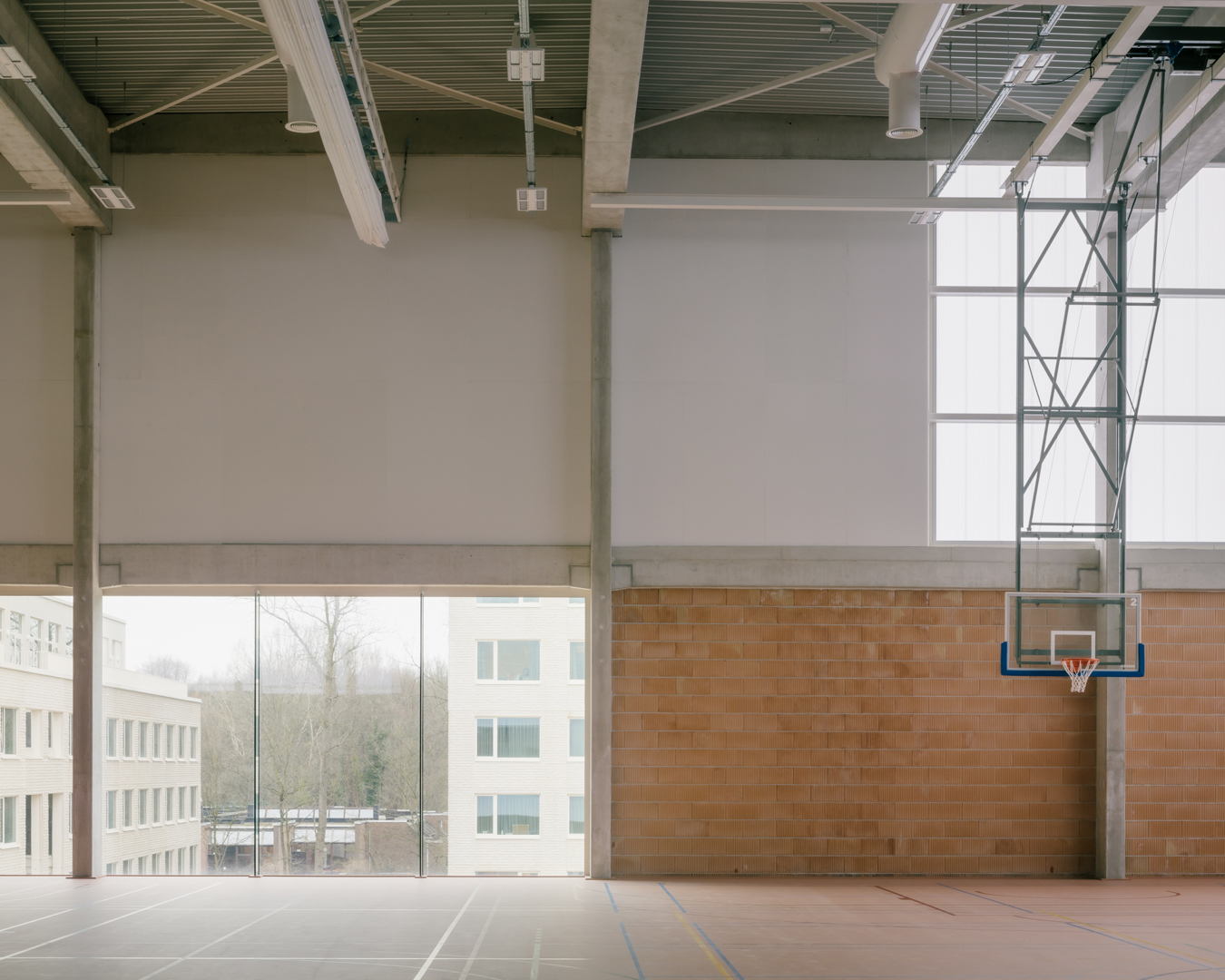 De drie volumes vervullen elk een eigen rol binnen de compositie. De Blok bevat de sporthal en aanverwante functies en vormt het zwaartepunt aan het plein. De Toren met studentenhuisvesting is het formele herkenningspunt vanop afstand en fungeert als oriëntatiebaken voor de hele campus. De Balk sluit het geheel af met een lage, horizontale structuur die extra studentenkamers huisvest. Zo ontstaat een architecturaal ensemble dat krachtig leest als één figuur, maar tegelijk zorgvuldig is ingebed in het bestaande landschap.