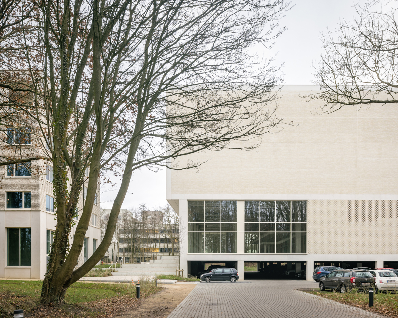 De collectieve ruimtes op het gelijkvloers vloeien letterlijk over in de publieke buitenruimte. De transparantie van de plinten, gecombineerd met het levendige pleinontwerp van Felixx Landscape Architects & Planners, zorgt ervoor dat het ensemble dag en nacht leeft. Dit continue menselijke ritme geeft het project zijn specifieke energie en identiteit. Het ensemble wordt zo een architecturaal knooppunt dat de universiteit zichtbaar verbindt met haar omgeving.