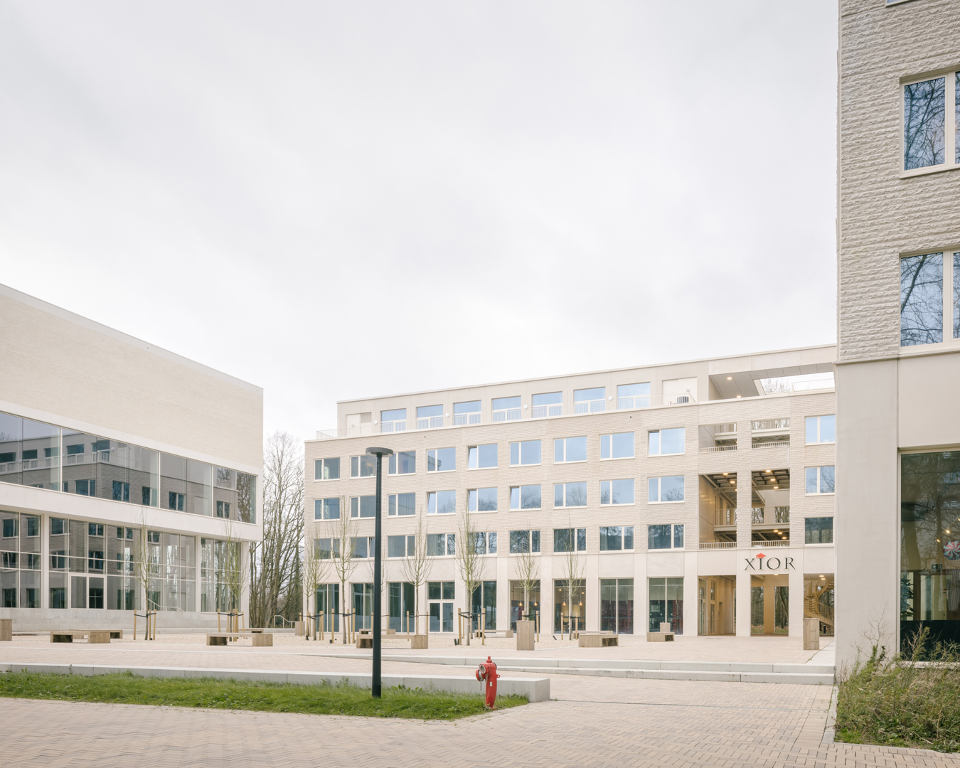 De ontwerpers vertrokken vanuit een grondige analyse van de bestaande campusstructuur. Het onderzoek van POLO Urbanism leverde een beeldkwaliteitsplan op dat het ontwerp richting gaf. De gebouwen sluiten aan bij de logica van de bestaande architectuur: helder, leesbaar en zonder overbodige complexiteit. Door het programma op te splitsen in drie herkenbare volumes — de Blok, de Balk en de Toren — ontstond een ensemble dat een nieuw plein omsluit en een gevoel van stedelijkheid toevoegt aan het groene landschap.