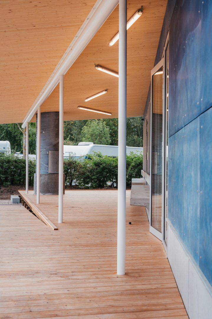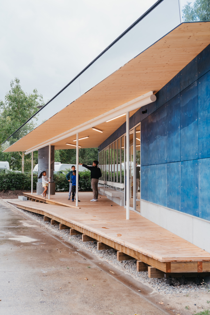Het gebouw is gepositioneerd als het kloppend hart van het terrein, een herkenbare kern die zich toont als een dorpshuis of kleine school. Het dak speelt hierin een hoofdrol: geïnspireerd op de vorm van een woonwagen, overspant het als een grote luifel zowel het binnenprogramma als de overgang naar buiten. Deze dakvorm creëert geborgenheid, nodigt uit tot gebruik en zet aan tot interactie. Onder de luifel kunnen bewoners elkaar ontmoeten, spelen, samen eten of deelnemen aan workshops – ongeacht het weer. De architectuur is daarmee expliciet uitnodigend en sociaal georiënteerd.