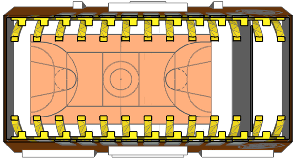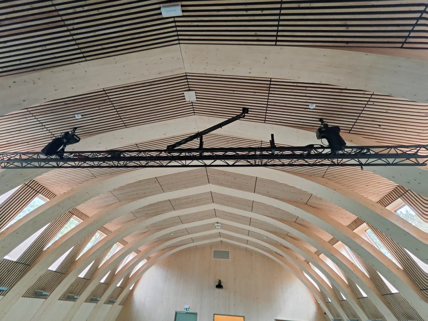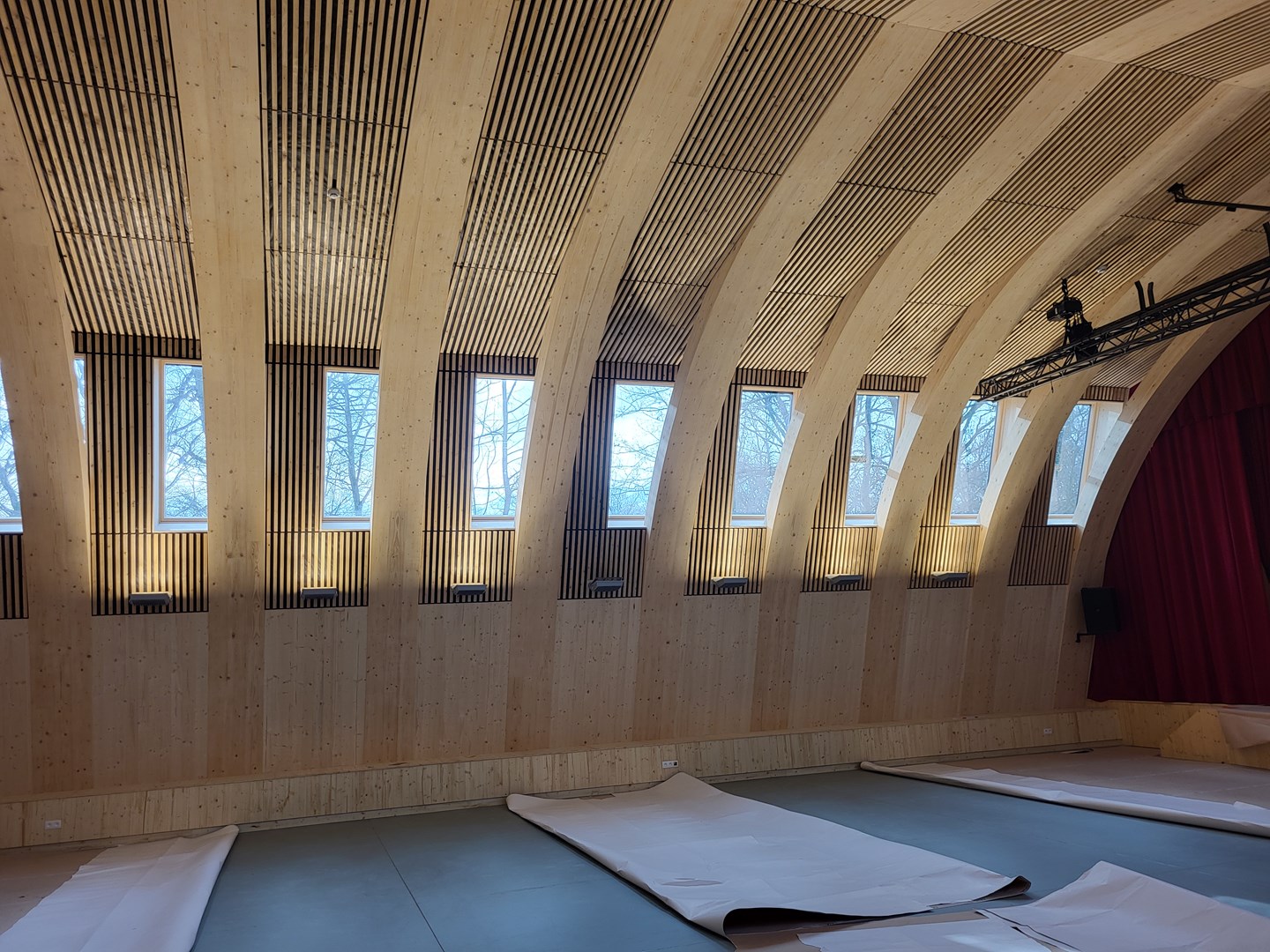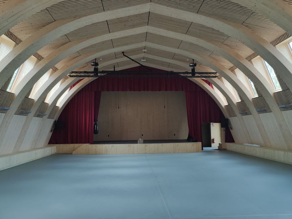 - Nagalmtijdbeheersing: Wanden in de zaal kregen 4 cm minerale wol afgewerkt met zwart textiel en houten latten, om het zicht te bewaren en beschadigingen tegen te gaan Dit garandeert akoestische demping zonder visuele of functionele concessies.
