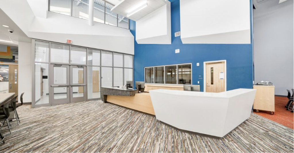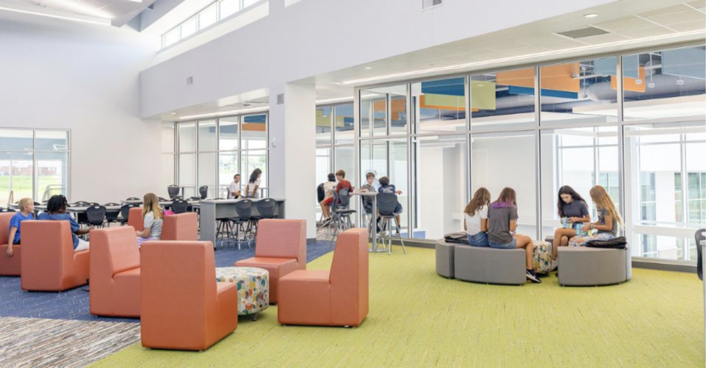 Interface werd geselecteerd als partner voor het project om samenwerkend leren te bevorderen door middel van design en om de onderwijsruimten naar een hoger niveau te tillen. Bij de ontwikkeling van het interieur verbond het team deze waar mogelijk met de hoekige, architecturale elementen van het gebouw. Deze overweging is terug te vinden in het tapijtpatroon in het mediacentrum, de verbindingspunten van het tapijt en het opnemen van veerkrachtige vloerbedekking in de entree van het hoofdgebouw.