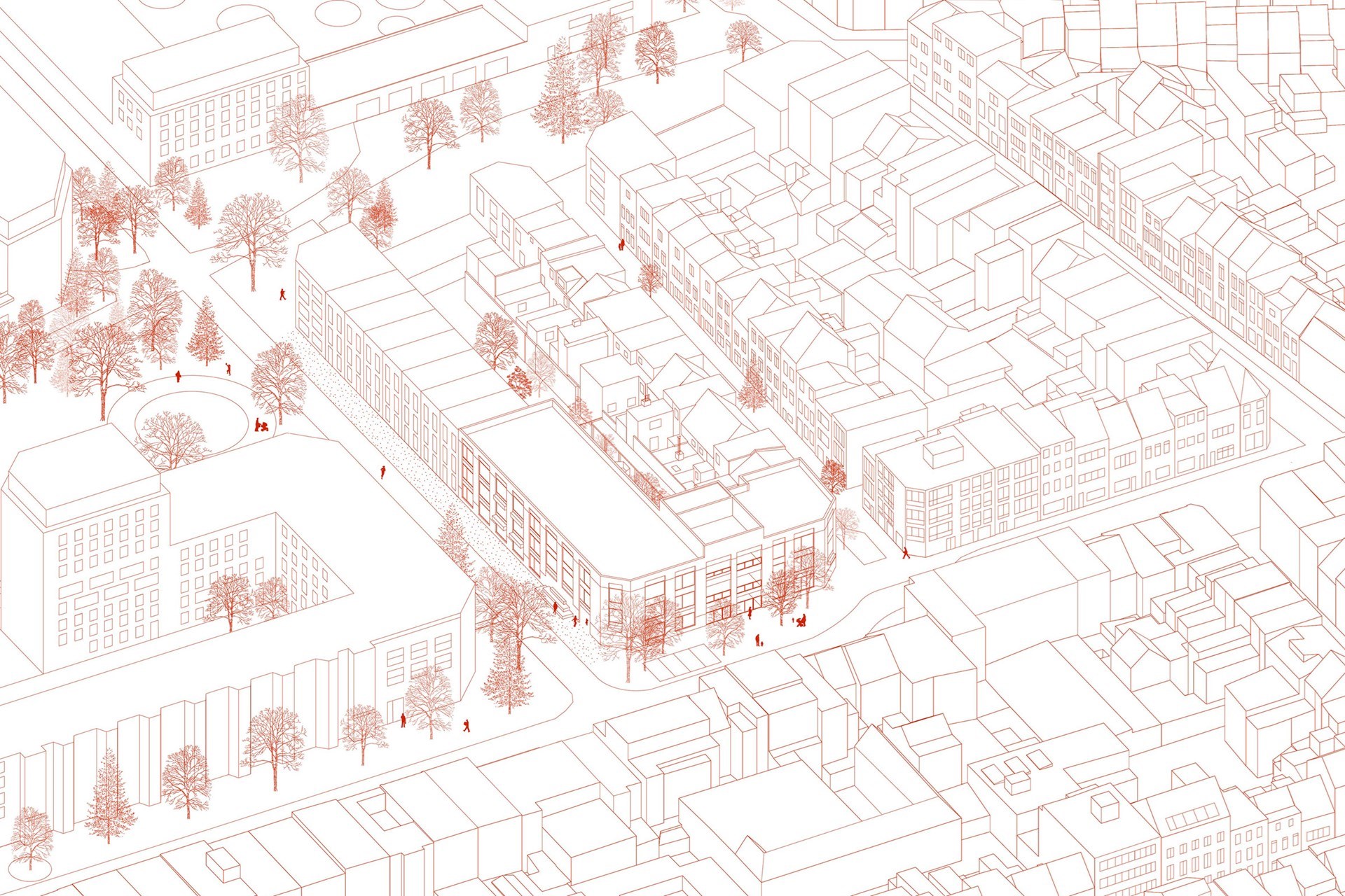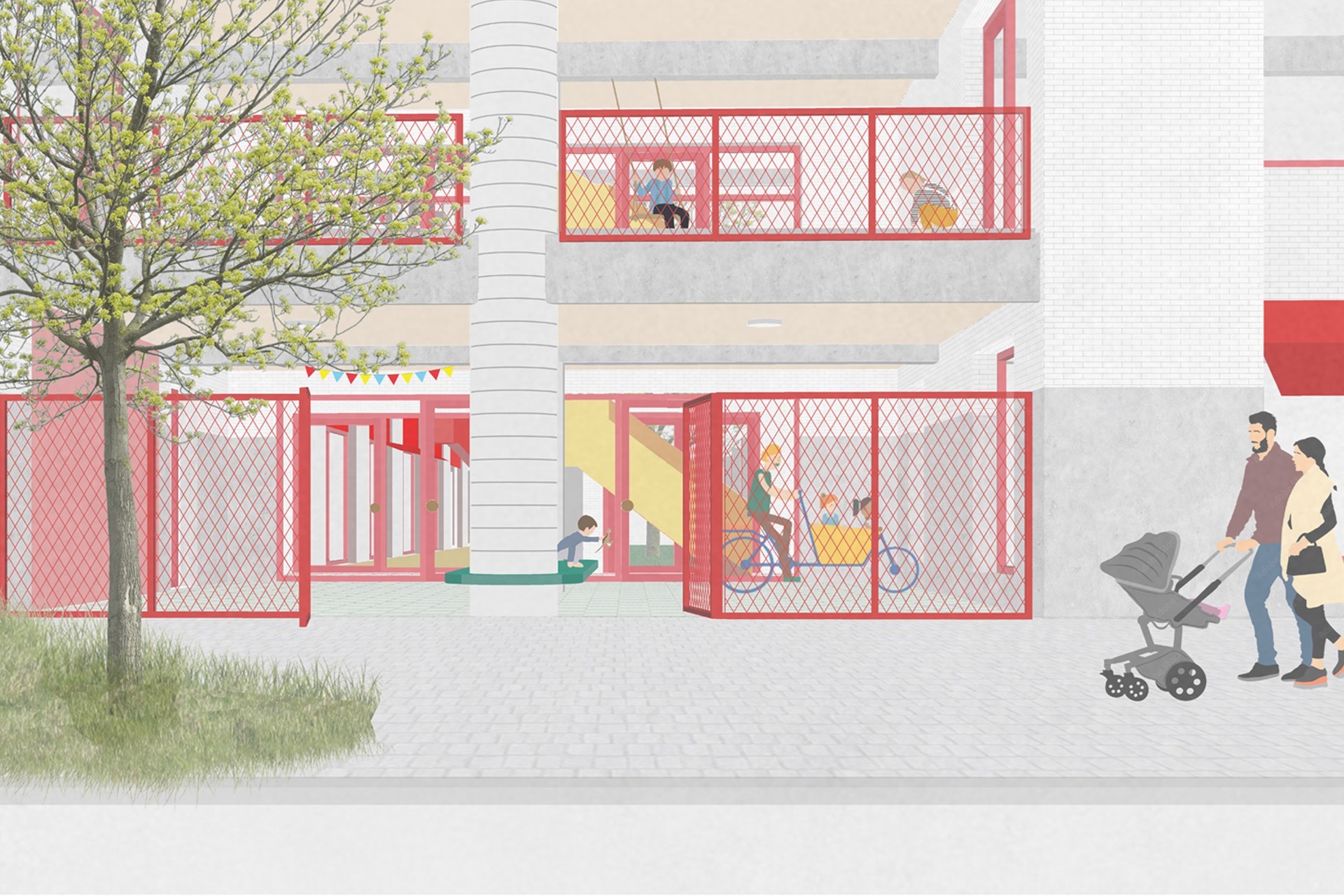 Door de open inkompartij ontstaat er een interessante relatie tussen het openbaar domein en het binnengebied. Het binnengebied sluit aan bij de functies op het gelijkvloers en geeft zo aanleiding tot intens gebruik. De binnentuin wordt ontworpen als een echte zuidgeoriënteerde tuin, een stukje natuur voor de allerkleinsten.