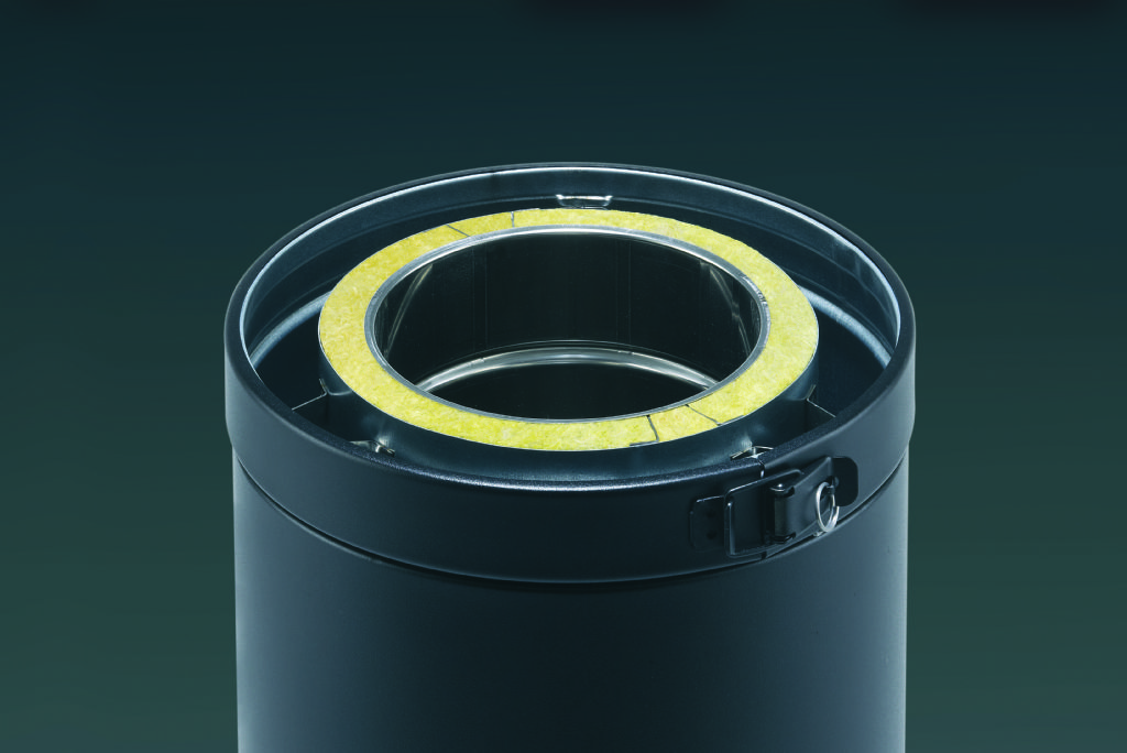 Binnenin is één sectie met steenwol gevuld. Dat zorgt voor een veilig trekkend rookkanaal. Een andere sectie zorgt voor de aanvoer van de verbrandingslucht.