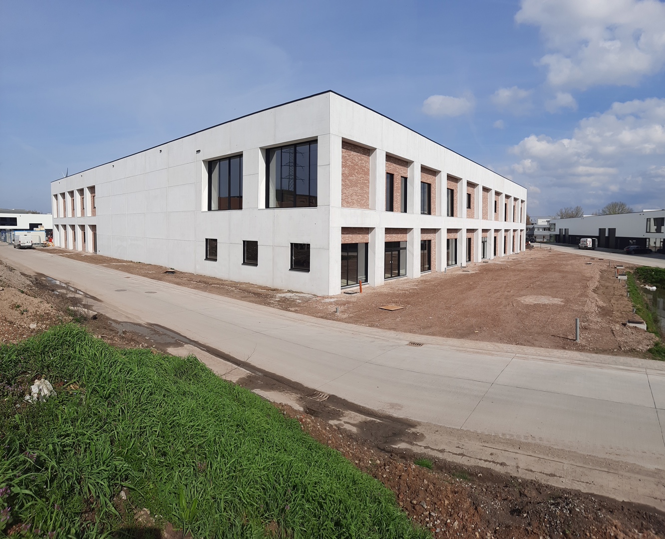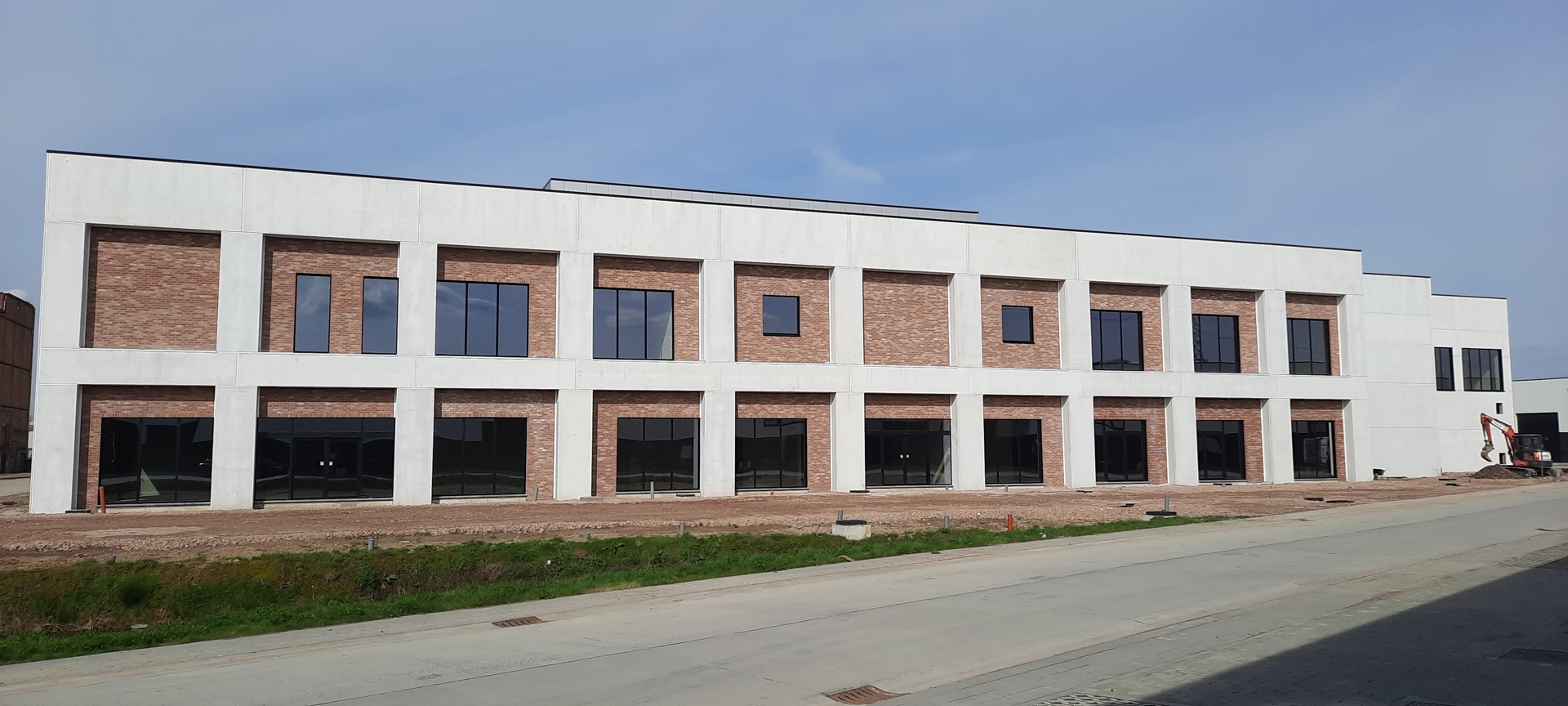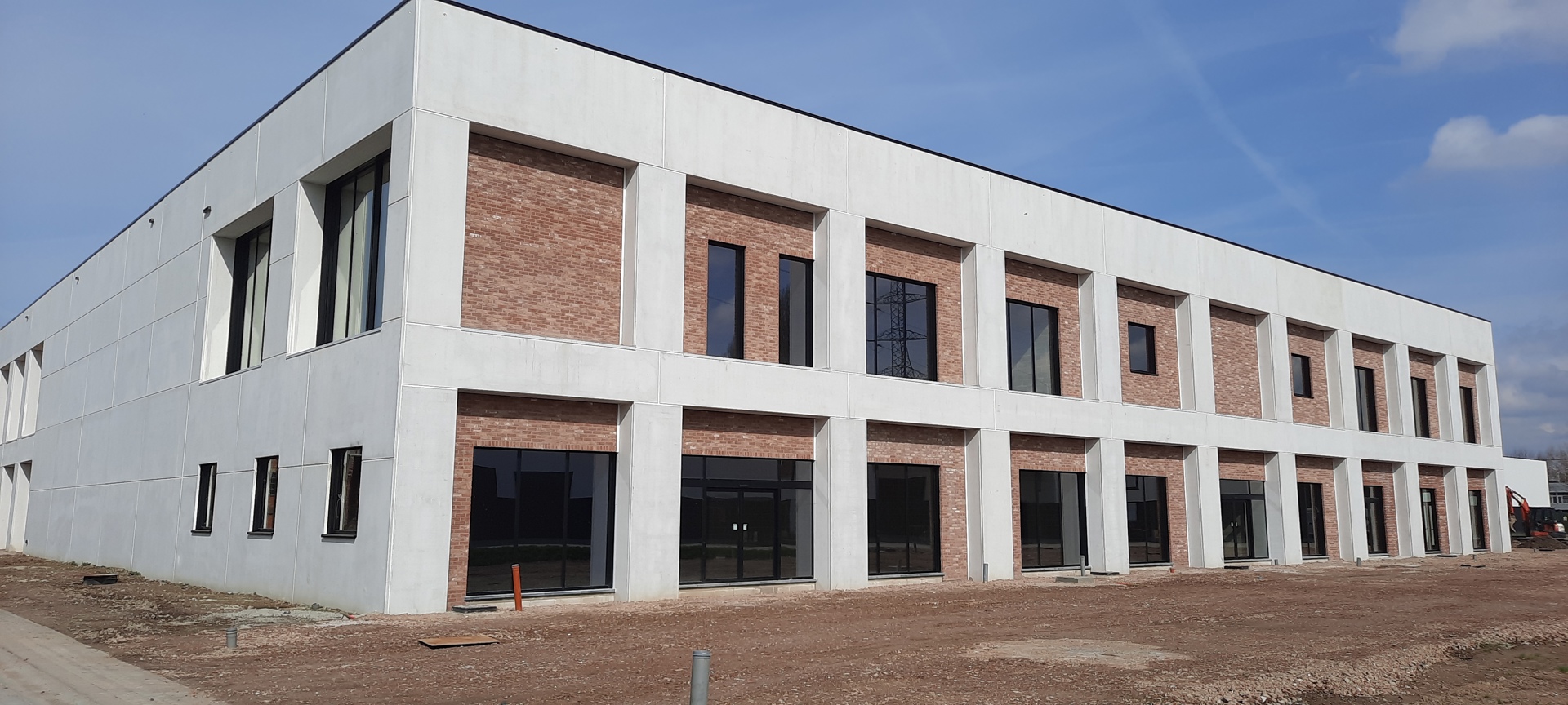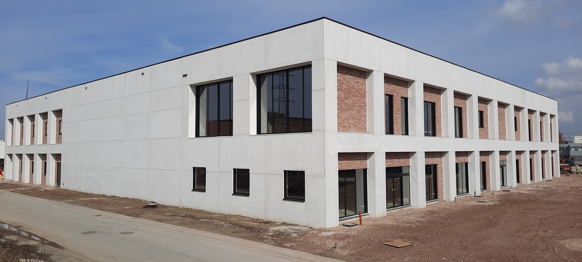 Op de voormalige Catala-site staan een aantal industriële gebouwen die opvallen door hun combinatie van baksteen en beton. Die aanblik heeft meegespeeld in de ontwerpkeuze voor deze werkplek, waar eveneens baksteen – in de vorm van steenstrips – en vooral beton de gevel bepalen. Voor de sandwichpanelen uit prefab beton werd een beroep gedaan op LG Beton. “Een project op onze maat”, vertelt Roel Goossens, business process administrator bij LG Beton. “Op het vlak van productie kwamen we geen obstakels tegen die we niet tot in de puntjes beheren. Als lid van de Altez Group hebben we uiteraard ook een zeer korte en efficiënte lijn met de aannemer, wat een vlotte samenwerking in de hand werkt. Kwaliteit is voor ons uiteraard prioritair, maar daarnaast zijn ook communicatie, flexibiliteit en oplossingsgericht denken een wezenlijk onderdeel van onze filosofie. Voor de voorgespannen kolommen en balken werd onze concullega Betca nv ingeschakeld. LG Beton produceert wel kolommen en balken, maar die zijn niet voorgespannen.”