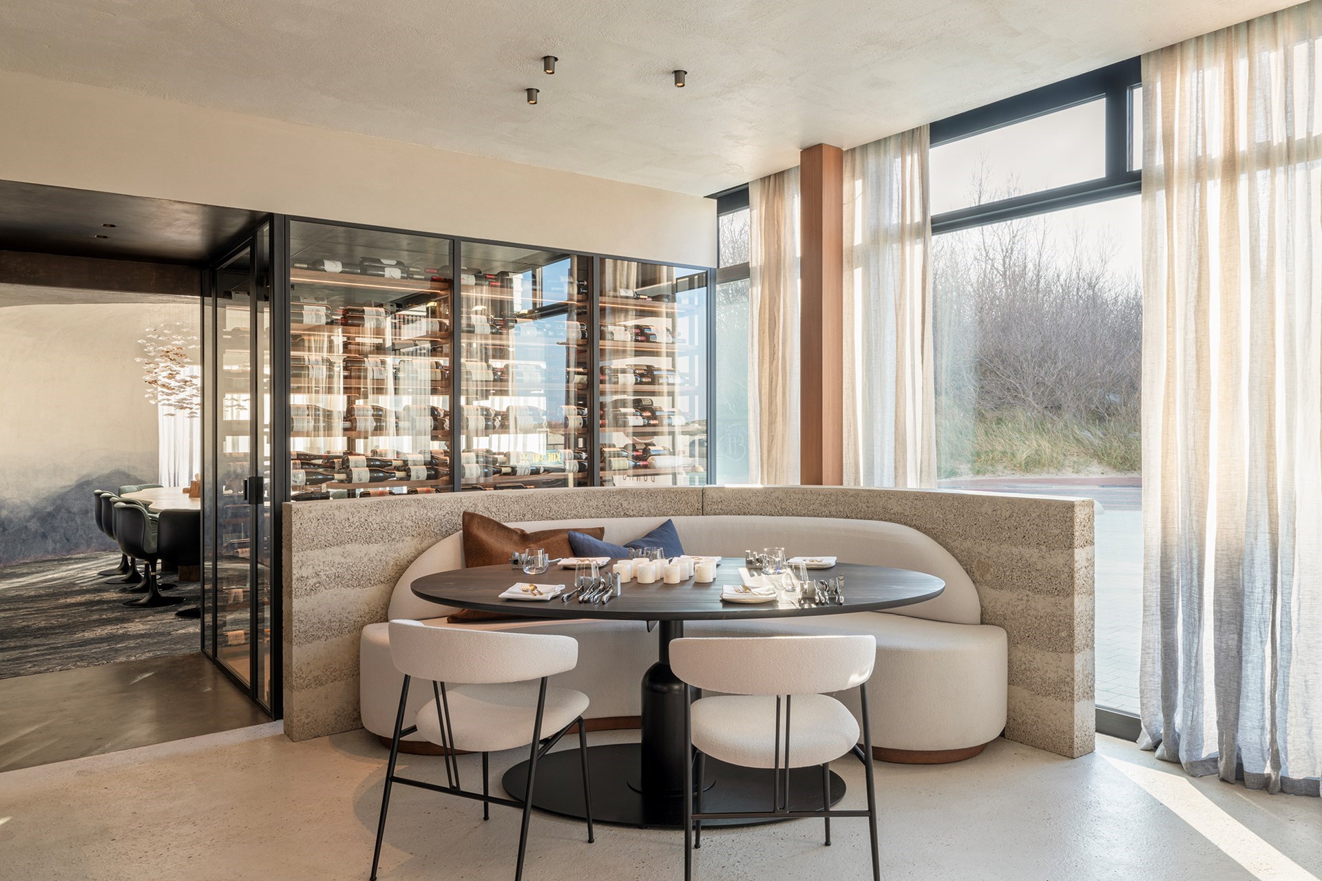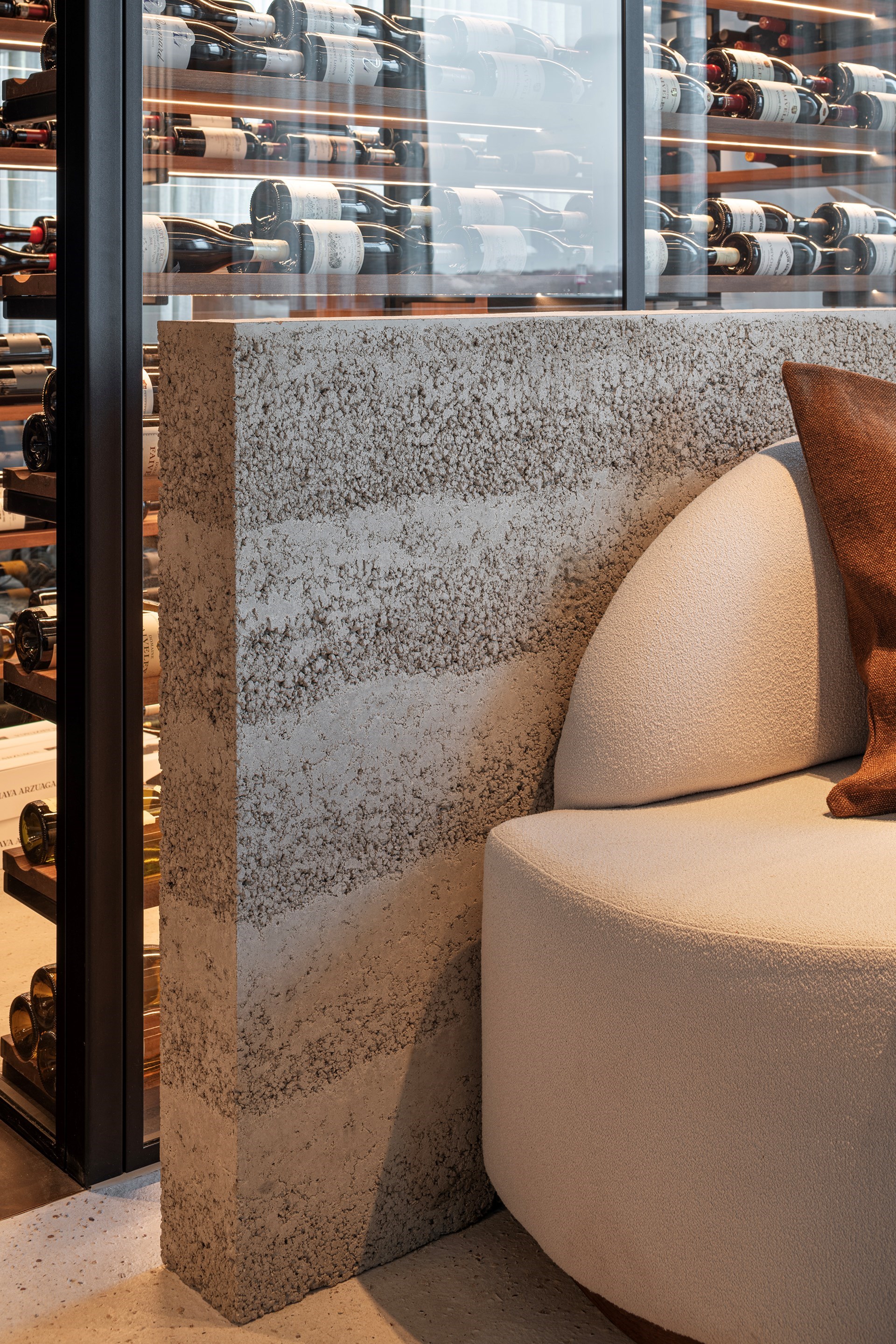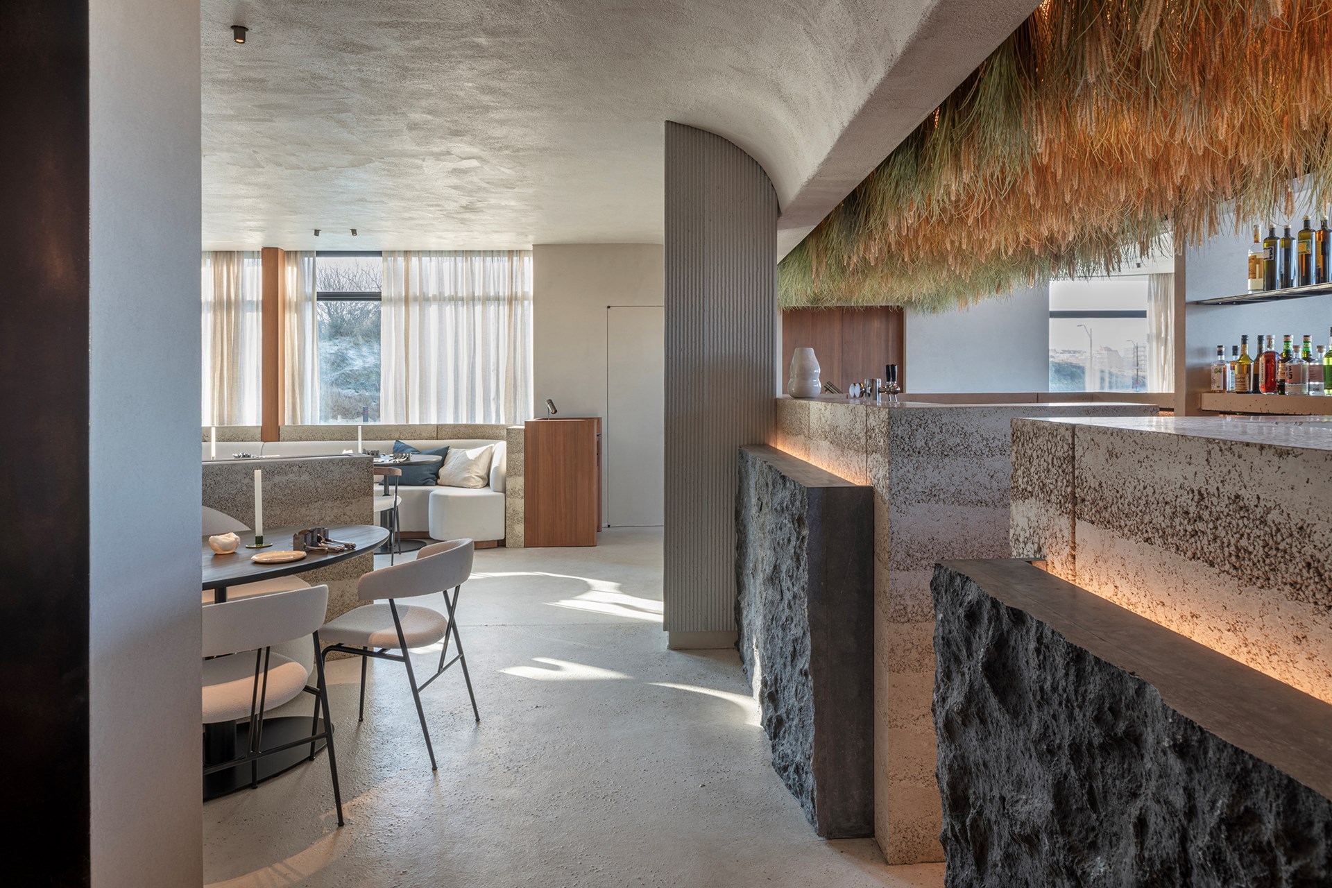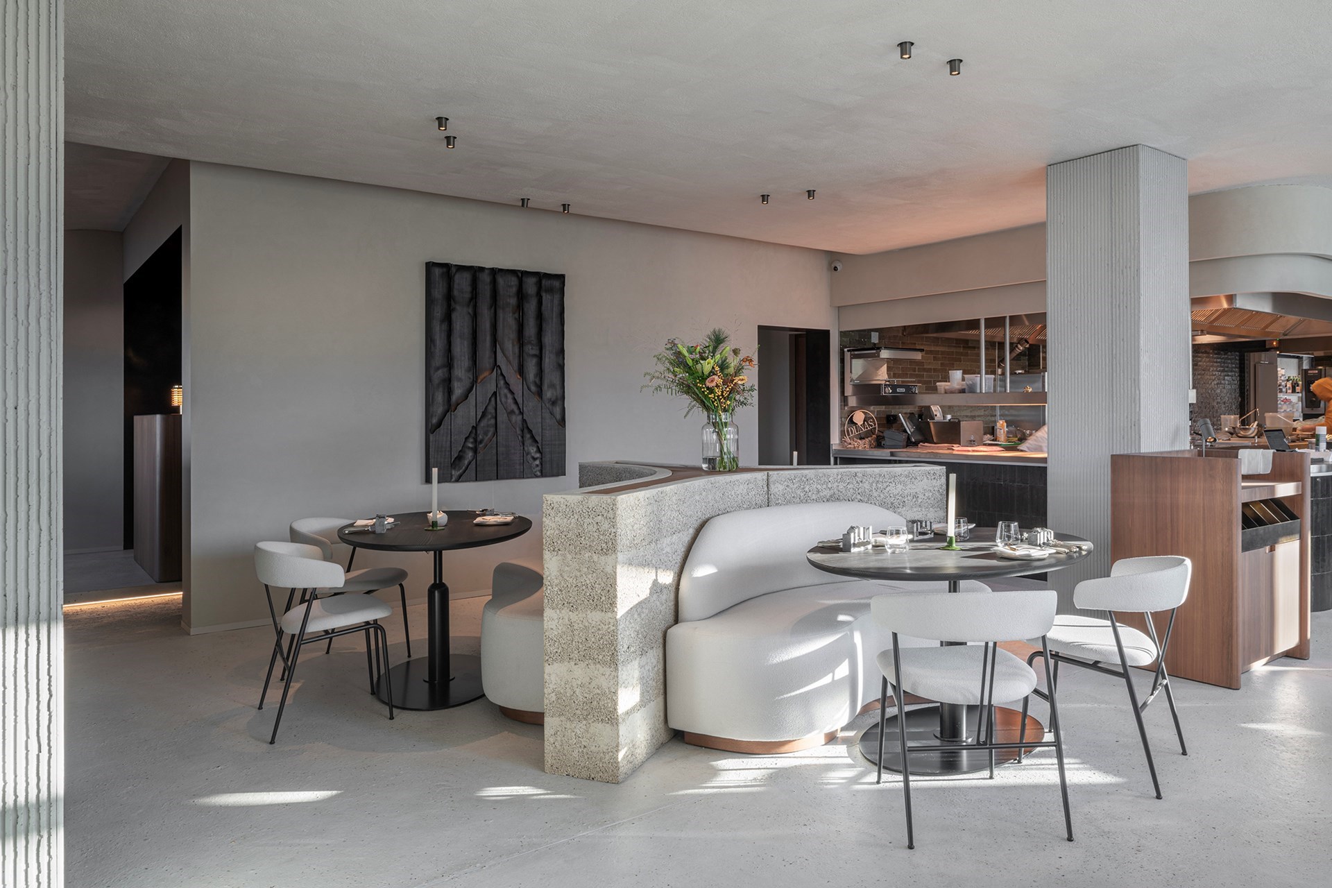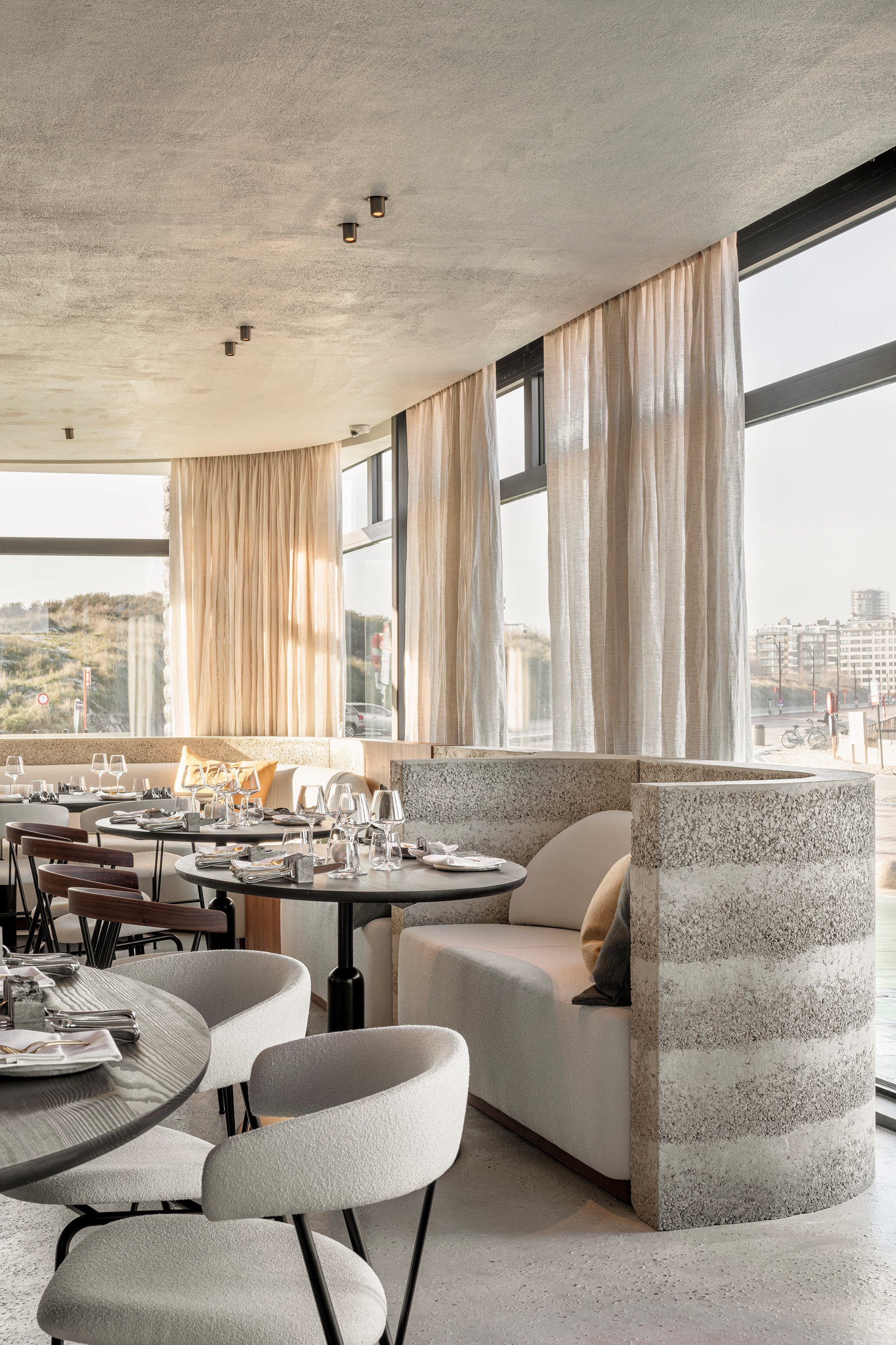 De Bellarose Flagshipstore in Brussel en Dunas Dine, een restaurant in Knokke, zijn twee mooie voorbeelden van de meerwaarde die prefab beton binnen kan creëren. In Dunas Dine is de hoofdrol weggelegd voor stampbeton. Zowel de rugelementen voor de zitbanken als de omranding van de bar werden in prefab stampbeton uitgewerkt door Enjoy Concrete. De bar werd aan de voorzijde ook nog bekleed met natuursteen. Het restaurant aan de Belgische kust had met de zee en de duinen een voor de hand liggende inspiratiebron. Werken met texturen en volumes bleek de juiste invalshoek om de zee en haar omgeving te vertalen naar een interieur. Maarten Durnez: “Stampbeton is een ideaal product om die textuur en dat volume te bekomen. De bovenkant van het barmeubel werd wel gepolijst om bestand te zijn tegen zuren. Hierdoor ontstond een terrazzo-effect. Het kleurenpalet werd afgestemd met Grain Design Office, het ontwerpbureau.”