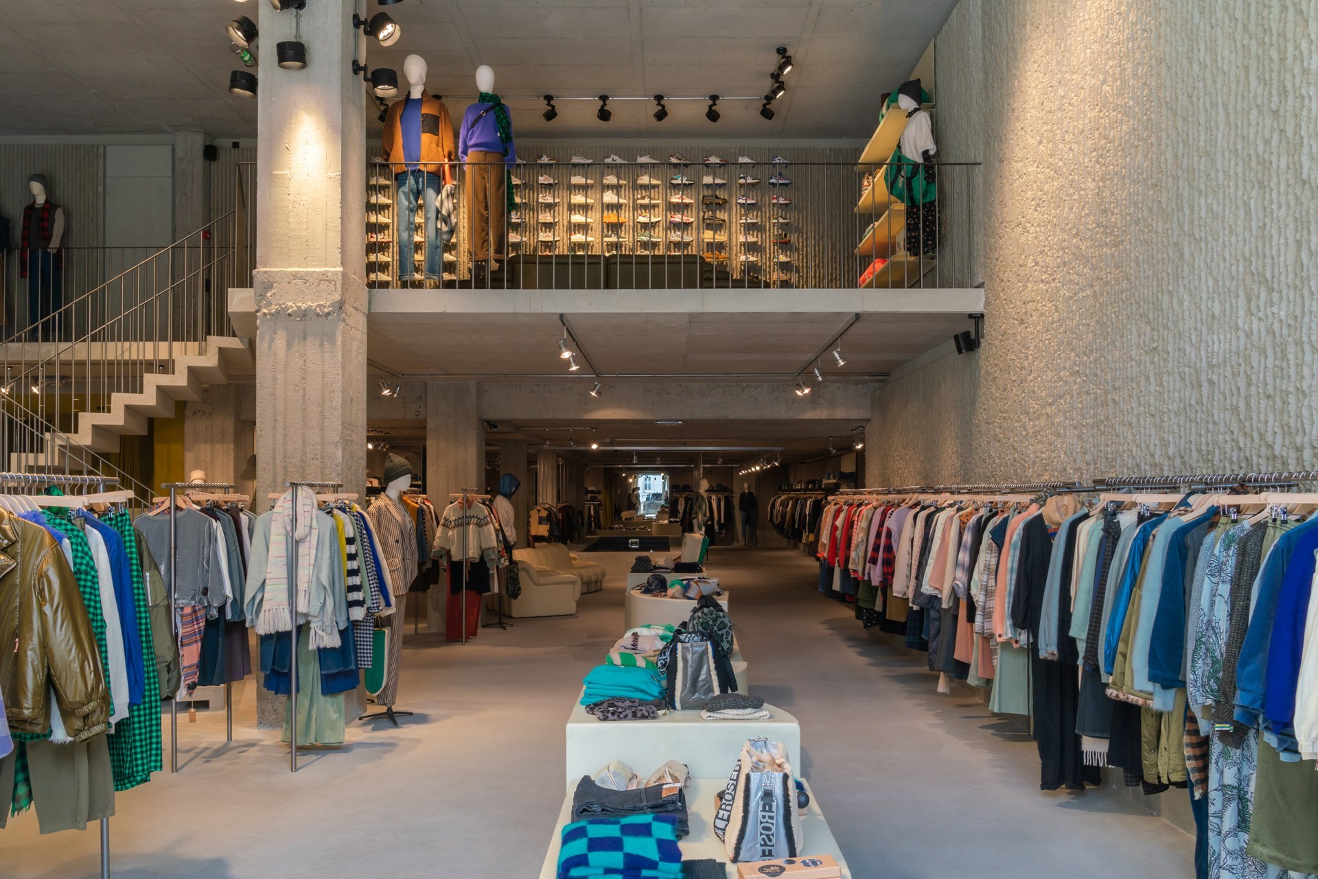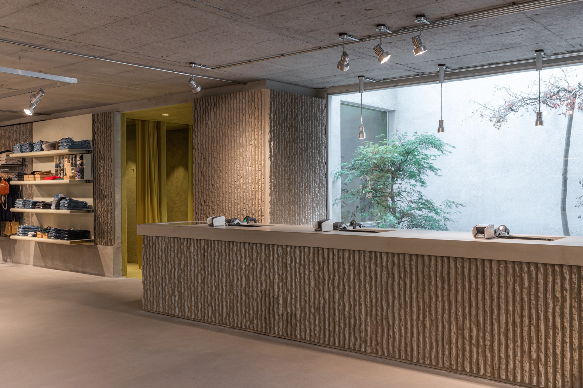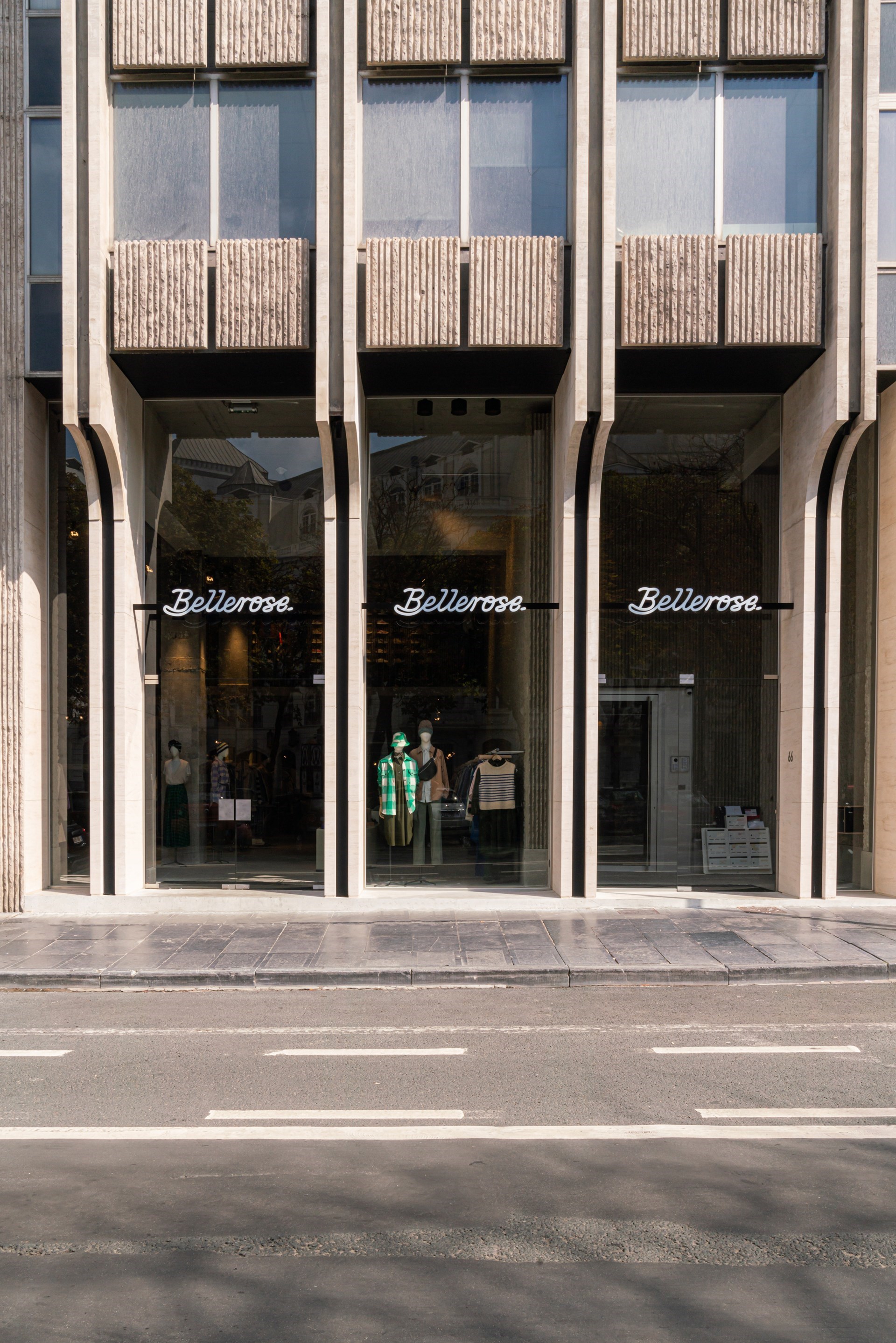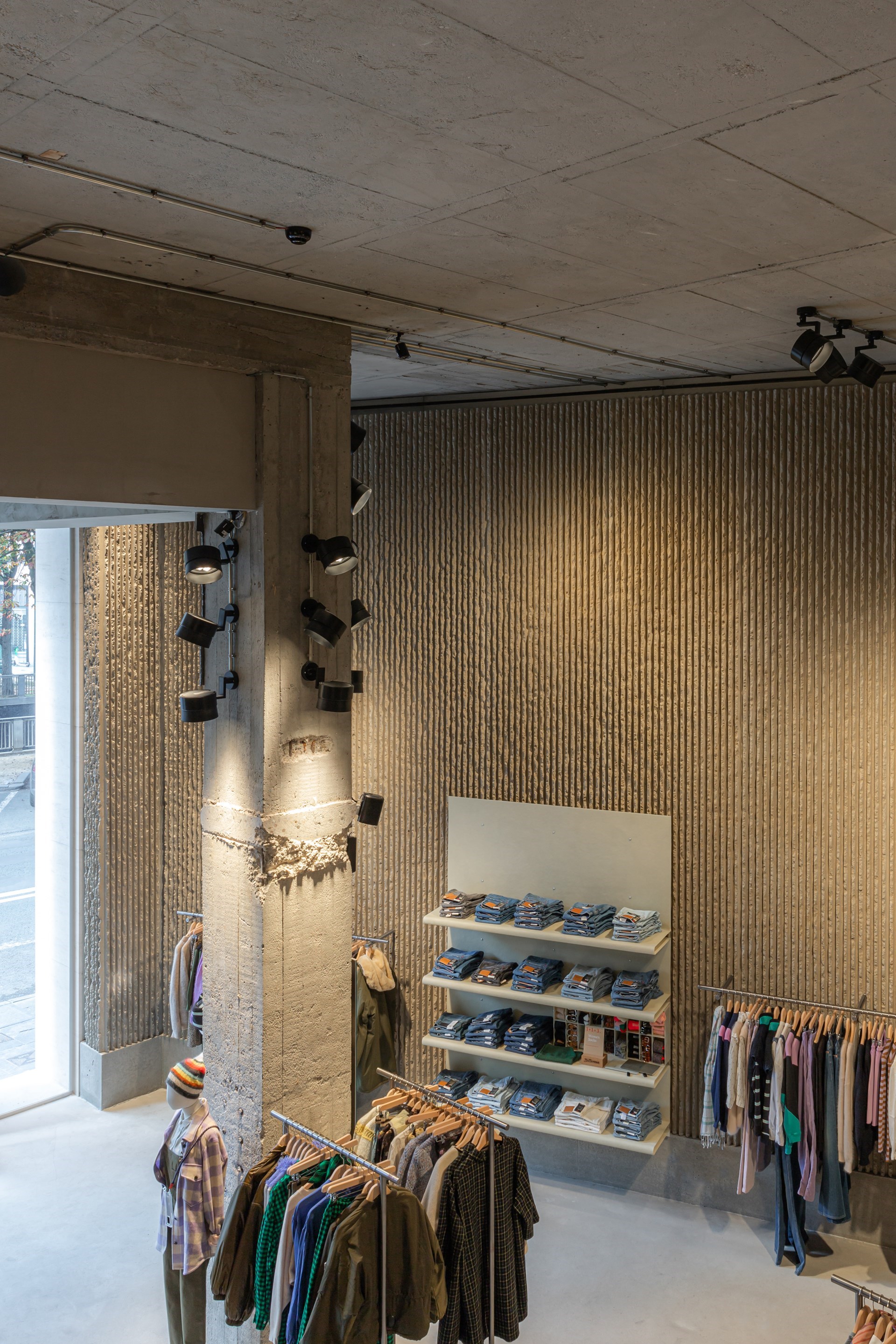 Ook in de Flagshipstore Bellerose in Brussel springen de prefab elementen van Enjoy Concrete in het oog. Voor dit project werden prefab betonpanelen gebruikt als wandbekleding voor de inrichting van de winkel. Vooraan in de winkel werden panelen met een hoogte van ruim 5 m toegepast. Voor het achterste deel van de winkel hebben de panelen een hoogte van 2 tot 2,5 m. De panelen corresponderen met de bestaande buitengevel van het pand, die een specifieke textuur heeft met een brutalistisch, verweerd uitzicht. Om dat effect ook binnen te bekomen, werden speciale rubberen, herbruikbare bekistingsmallen gebruikt.