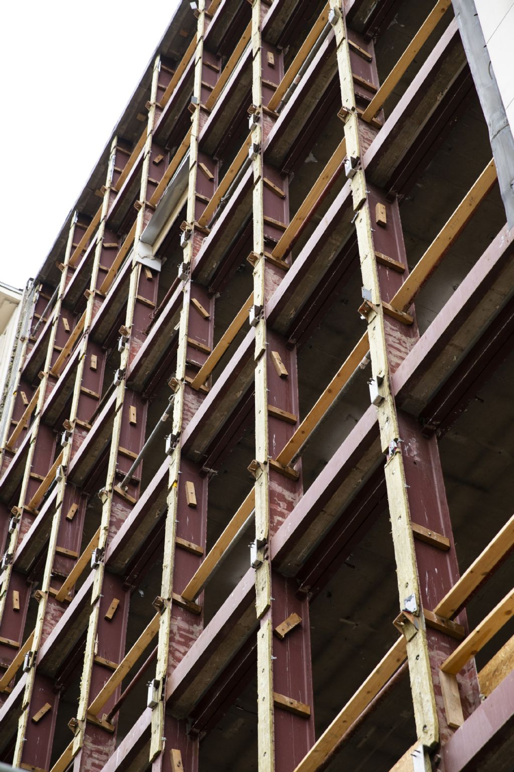 Om de terrassen te realiseren werden deze prefab gemaakt, voorzien van galvanisatie en aansluitend gelakt. Deze grote prefab elementen werden dan in hun geheel bevestigd aan de bestaande gevel.