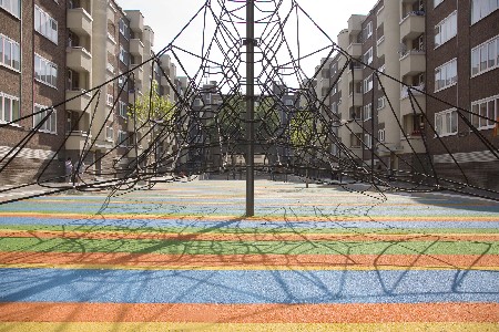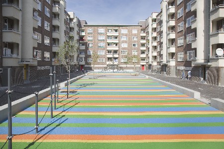 Stokpaardje van het renovatieproject is de herinrichting van de centrale binnenplaats. Allereerst is het de bedoeling dat die binnenplaats heel bereikbaar werd voor de inwoners, brandweer-, verhuis- en vuilniswagens. Maar wat vooral opvalt op het binnenplein is de veelkleurige, rubberen speelvloer. Het rubberen speeltapijt is afgebakend met een betonnen zitrand. Het tapijt zelf kantelt, waardoor de voorkant van het speelveld een halve meter lager ligt dan het maaiveld. In dat lagerliggende gedeelte kan men eventueel een zandbak plaatsen. Aan het hogerliggende hoofd van de speelvloer bevindt zich een zitbank, waar ouders en grootouders kunnen toekijken hoe hun kinderen spelen.
