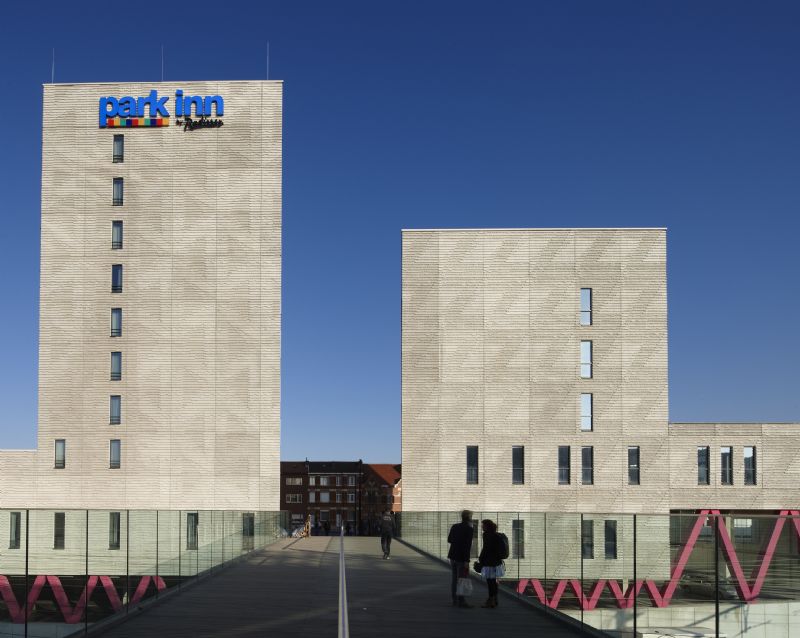 "De gevels zijn atypisch ten opzichte van andere gebouwen," zegt architect Kris Loix van archipelago | ar-te. "Enerzijds bestaan ze uit betonreliëfpanelen. In de betonnen gevel van Stratos staat een grote Z, om aan te duiden dat het gebouw zich aan het zuidelijke eind van het project bevindt. In de gevel van het meest noordelijk gelegen gebouw staat een grote N."
