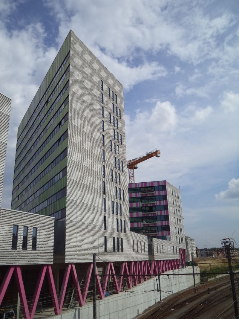 "Anderzijds hebben we gekozen voor aluminium gevels met een speciale kleurcoating, die afhankelijk van de lichtinval en de positie van de panelen een andere kleur laten zien. De aluminium gevel van Stratos is hoofdzakelijk groen, die van Mesos fuchsia. Het gaat om een soort gekleurde, transparante eindlaag die boven op een basis wordt gezet. Soms ervaar je de onderlaag en soms de bovenlaag. Ieder gebouw binnen de Kop van Kessel-lo heeft dan wel een andere kleur, toch stellen ze door het gebruik van dezelfde materialen een bepaalde eenheid tentoon" aldus Loix.