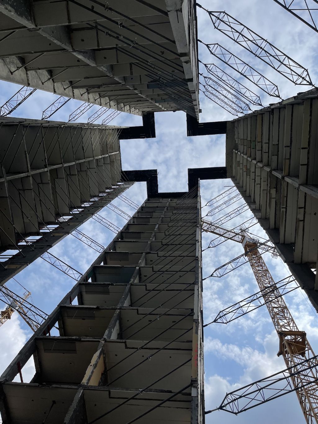 “Het is echt wel een opvallend project nu je dit zo allemaal voor je ziet", zegt Thomas. Wanneer je de woontorens voor de start van de verbouwingen van bovenaf bekeek, dan zou meteen de kruisvorm van het gebouw opvallen. De vier benen van het kruis vormden de appartementen met centraal de trappenhal.”
