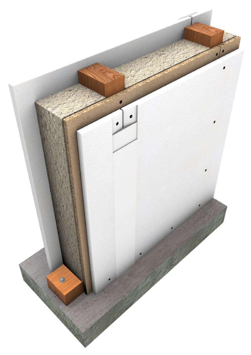 Op die OSB-plaat wordt dan nog een bijkomende PROMATECT-100-plaat geniet. Tussen beide zijden komt ten slotte een isolatie op basis van cellulose.
