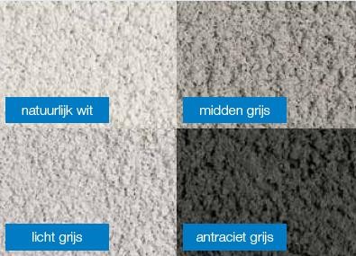 De Soundless spuitmortel is beschikbaar in vier basiskleuren: natuurlijk wit, lichtgrijs, middengrijs of antracietgrijs. Andere kleuren zijn mogelijk op aanvraag.