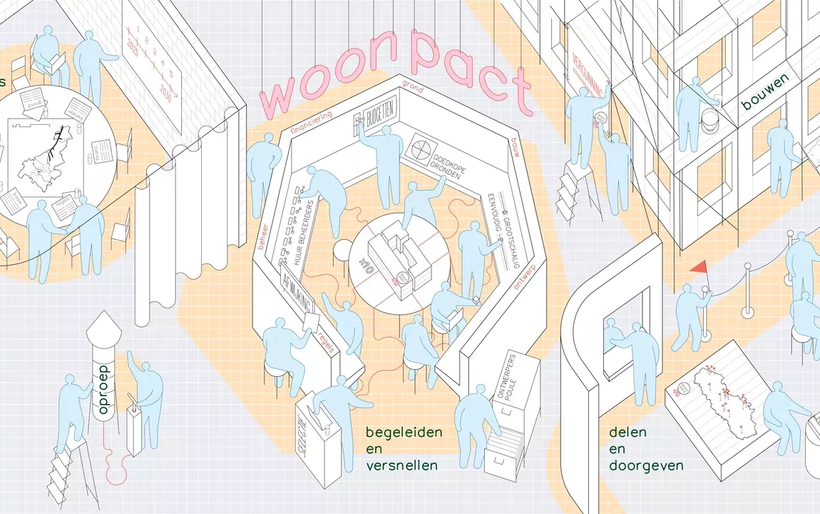 Die systeemblik wordt visueel samengebracht in een grote schema-tekening, die fungeert als denkraam voor het woonpact. De zes schakels — regels, grond, ontwerp, bouw, beheer en financiering — vormen samen de motor van betaalbaarheid. Pas wanneer elke schakel goed staat, kan het geheel draaien. De tekening is nadrukkelijk geen blauwdruk, maar een startpunt om te bepalen waar op korte termijn knoppen kunnen worden ingedrukt, en waar op langere termijn structurele hervormingen nodig zijn.