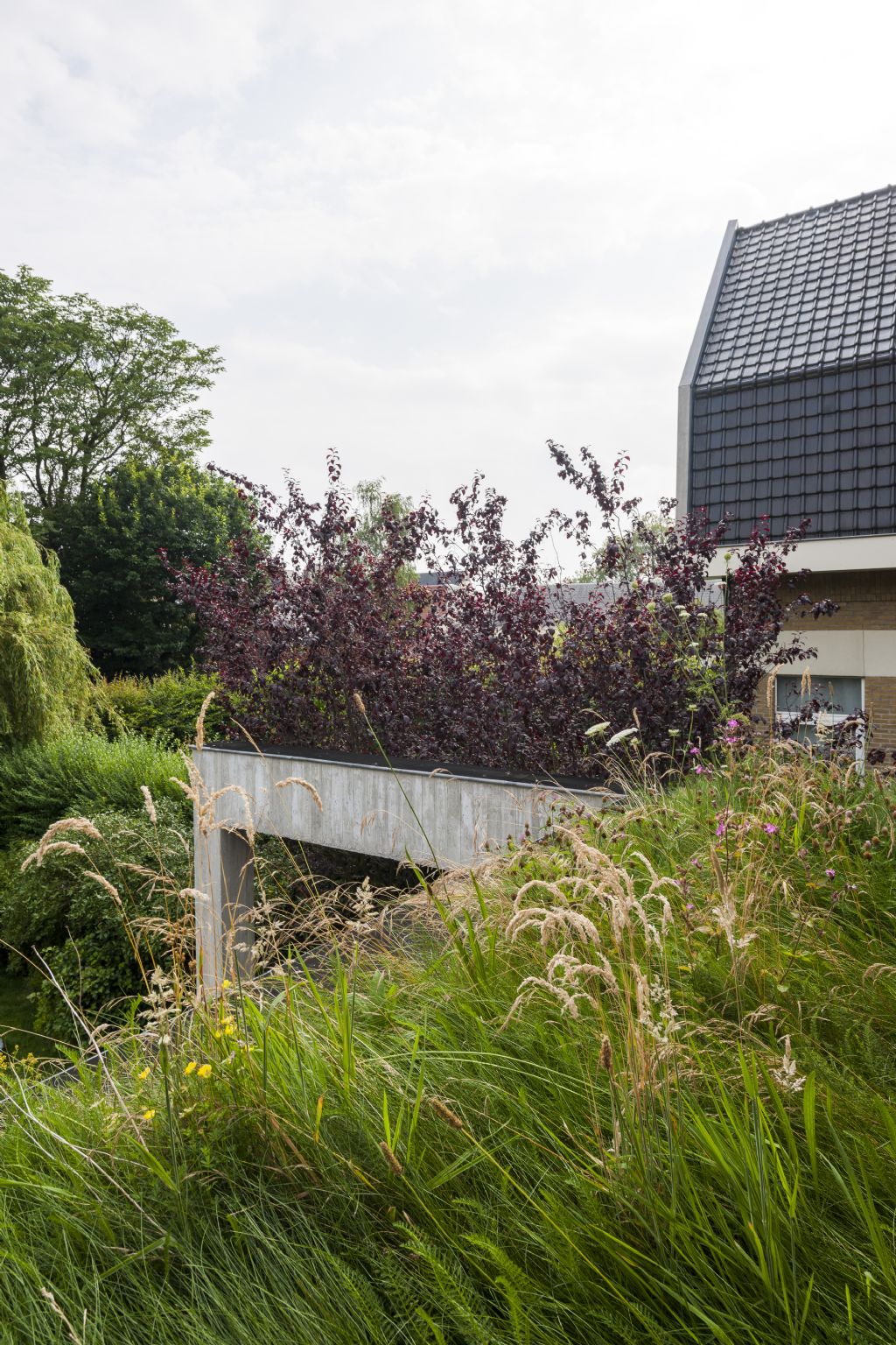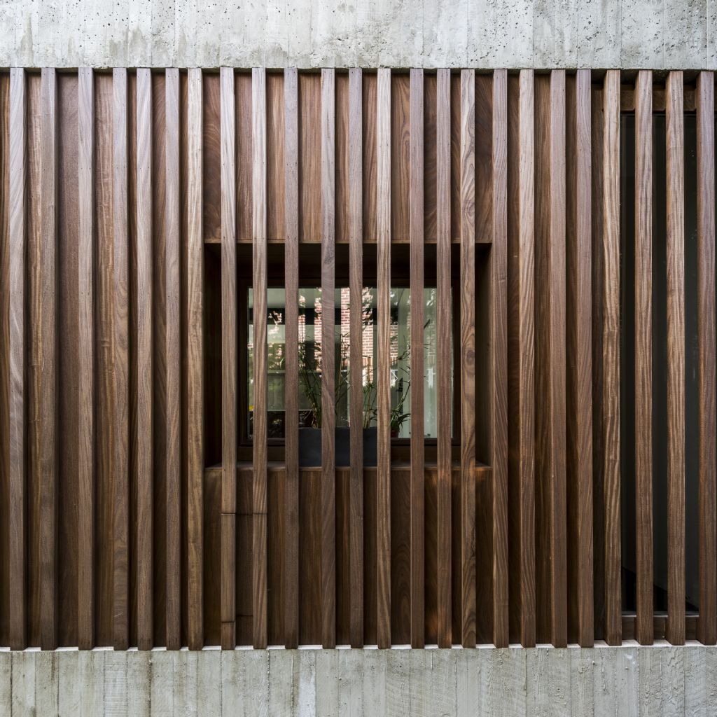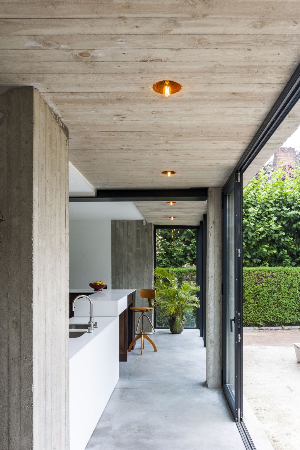 De uitbreiding werd uitgevoerd in met ruwe houten planken bekist beton, trouw aan de traditionele methode. Het beton is zowel opvallend als bescheiden, waardoor het een eerlijke en tijdloze uitstraling heeft en de aandacht niet afleidt van de essentie. Als tegenwicht voor het koude grijs van het beton werd gekozen voor een houten gevelbekleding. Mede omwille van de privacy verbergt de houten gevelbekleding een raam en een deur die toegang geeft tot de berging, alsook een kastje voor de Tesla Wall Connector van de eigenaar. Bovenop de uitbreiding werd een groendak met wilde bloemen voorzien. Op de eerste verdieping krijg je een uitzicht dat de nadruk legt op de uitbreiding van de tuin.