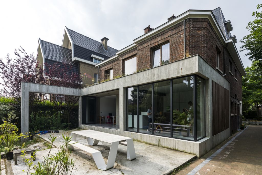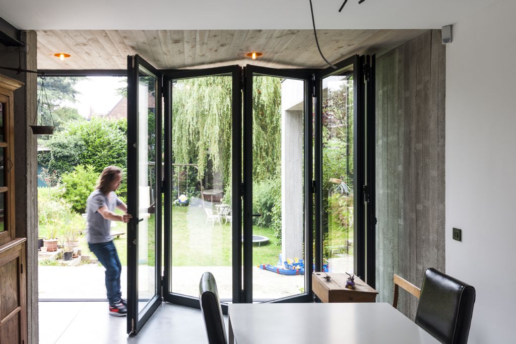 De eigenaars, een gezin met drie levenslustige jongens, zitten graag buiten en vinden het leuk om zowel in de zomer als in de winter te barbecueën. Daarom voorzag Qatar Architecten een uitbreiding in glas en beton aan het achterste gedeelte van het huis. De uitbreiding, die bijna uit het huis kruipt in de richting van de tuin, zorgt voor een heroriëntering van het leven en voor een direct contact met de tuin. Het zes meter brede accordeonraam kan volledig worden opengezet en doet zo de grenzen tussen binnen en buiten vervagen. De keuken en de eetkamer bevinden zich in het achterste deel. Doordat de tuin op het noorden gericht is, zorgt het kamerbrede raam voor constant daglicht in het hart van de woning.