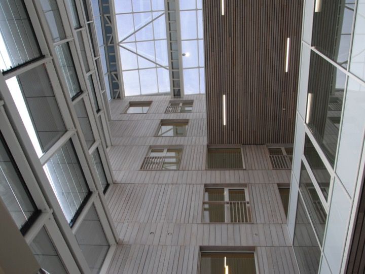 Alides Projects, een onderdeel van Group Maes, kwam met het idee op de proppen om het bestaande, vervallen gebouw op het Oktrooiplein te vervangen door een modern kantoorgebouw dat gewapend is tegen de toekomst. Opvallend zijn de verdiepingen die trapsgewijs meer naar voren komen. Elegant, maar ook nodig: op deze manier blijft de ademruimte van het Oktrooiplein gewaarborgd. Het kantoorgebouw is ingedeeld volgens een H-grondplan, waardoor zowel de kantoren in de oost- als westvleugel een maximum aan zonlicht krijgen. Die oost- en westgevel zijn opgebouwd uit geïsoleerde houtskeletwanden met aan de buitenzijde tegelpannen in een mix van vier kleuren. De zuidgevel is volledig beglaasd met vliesgevel (kantoren) en five-S (atrium, systeem Groven+). In het midden van het gebouw ligt een volledig beglaasde buitenruimte met beglaasde passerellen op de tweede en vijfde verdieping.