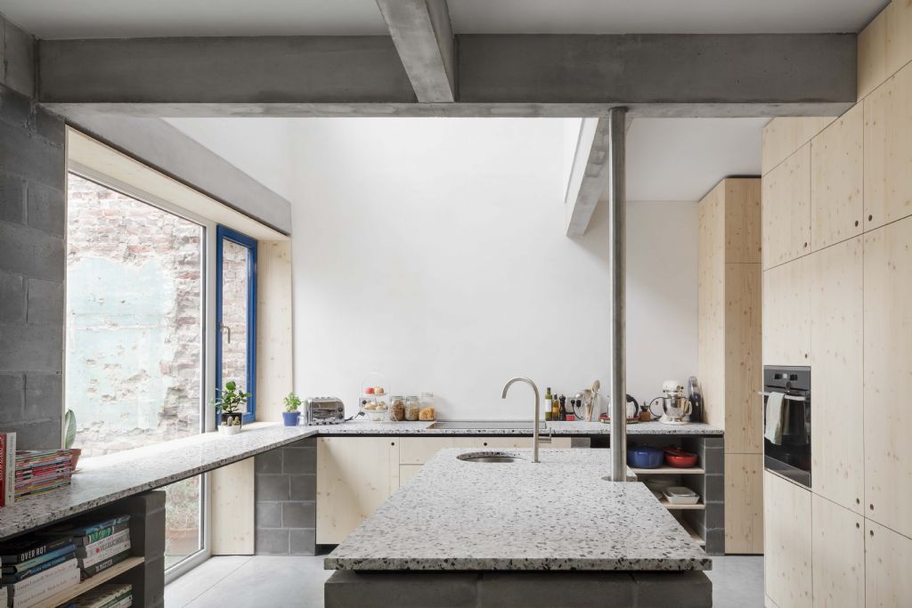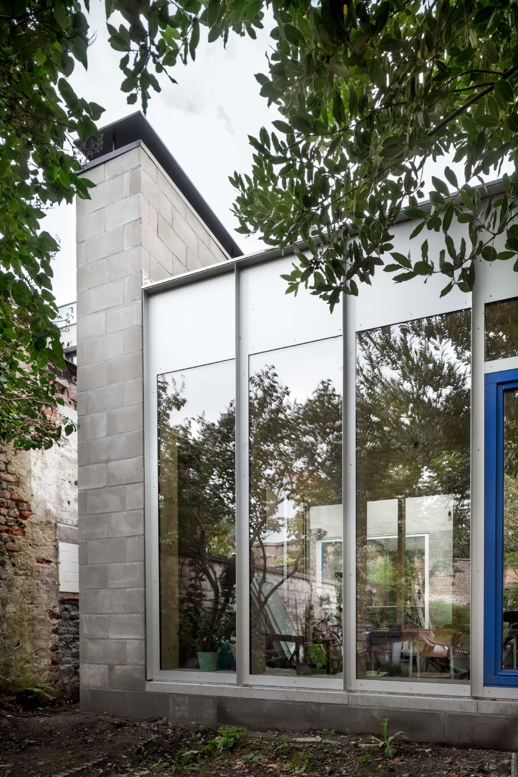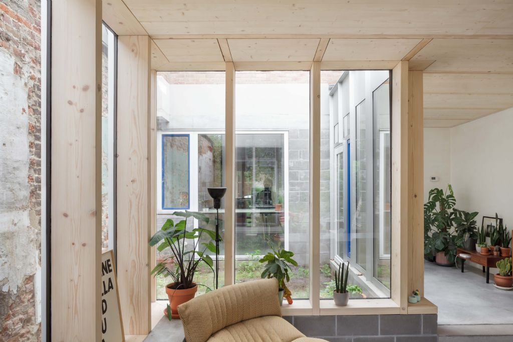 De gelijkvloerse verdieping werd gestript tot het hoofdvolume en uitgebreid met een paviljoenstructuur. Doordat het nieuwe volume afstand neemt van de huidige woning en de aanpalende bebouwing ontstaat er een smalle passage tussen het nieuwe volume en de rechterbuur waardoor daglicht binnenvalt tot diep in het hoofdvolume. Door de indeling vloeien alle ruimtes subtiel in elkaar over zonder hun eigenheid te verliezen.