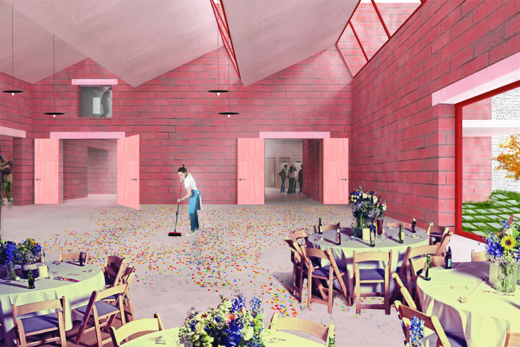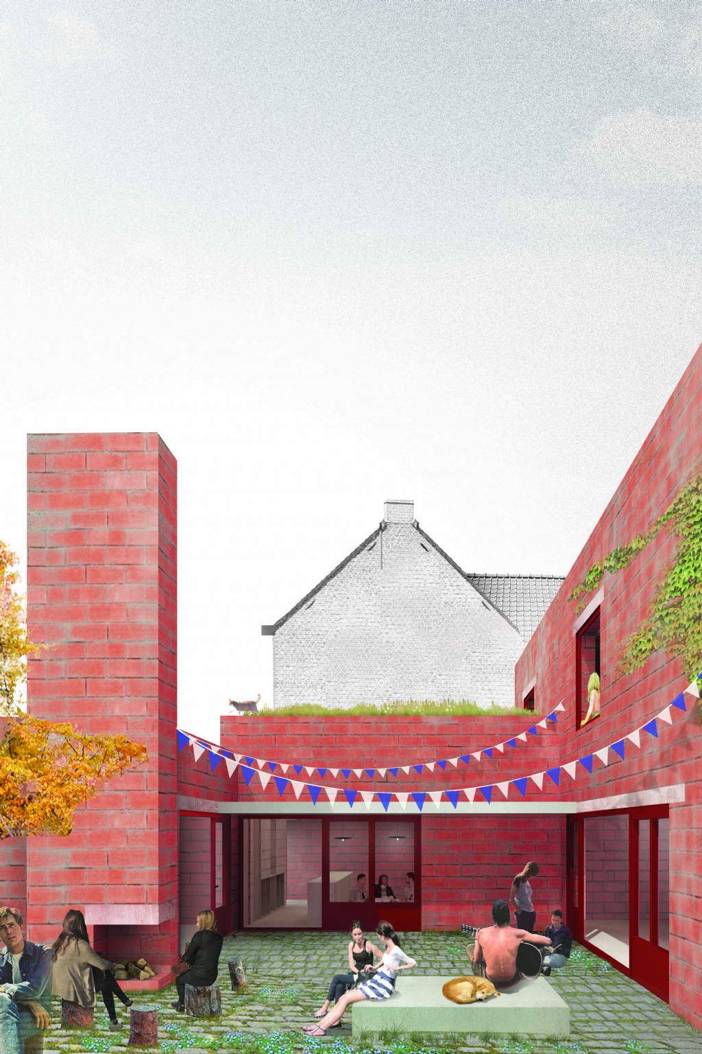 Het centrum ontwikkelt zich rondom twee buitenkamers. Beide buitenkamers bemiddelen tussen het jeugdontmoetingscentrum en de buurt, maar krijgen ook het statuut van ‘evenementenkoer’. Het gebouw toont zich op diverse manieren en laat veelzijdig gebruik toe dankzij de gelaagdheid. Volumes worden onderling verbonden door verschillende doorzichten, binnenramen en circulatie-assen, maar toch zijn ze helder afgebakend.