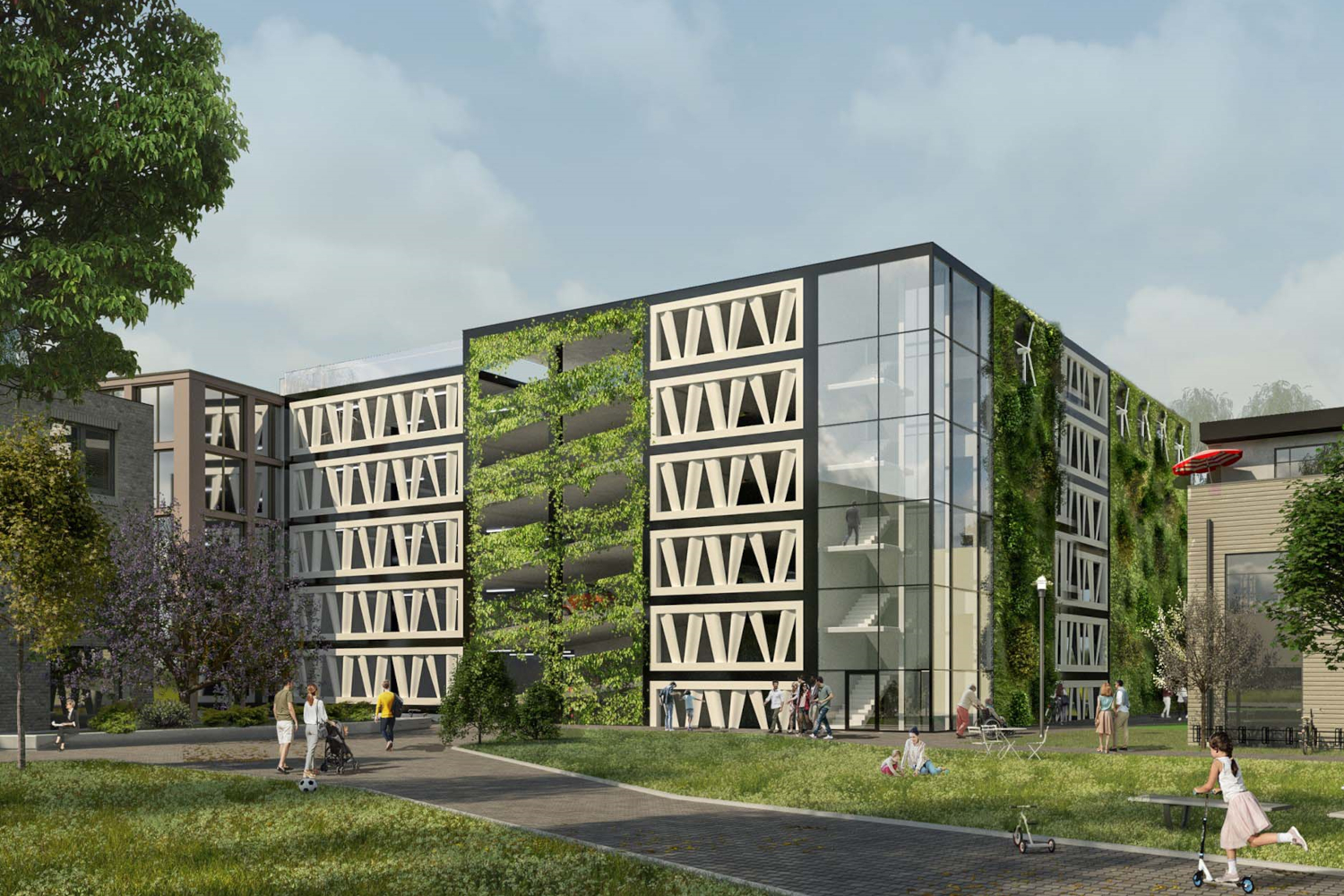 Naast de wieken gebruikt de architect groene muren om insecten aan te trekken. Het dak van de garage wordt bedekt met zonnepanelen, waarvan de opgewekte energie wordt opgeslagen in batterijen. Deze energie kan worden gebruikt om elektrische voertuigen op te laden die in de garage worden geparkeerd.