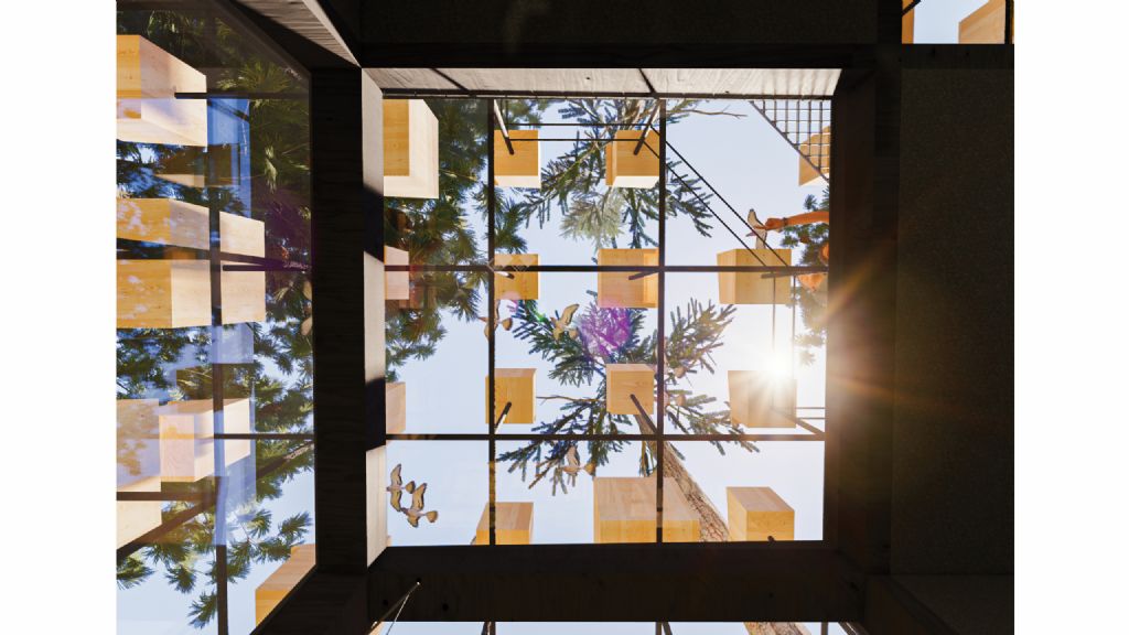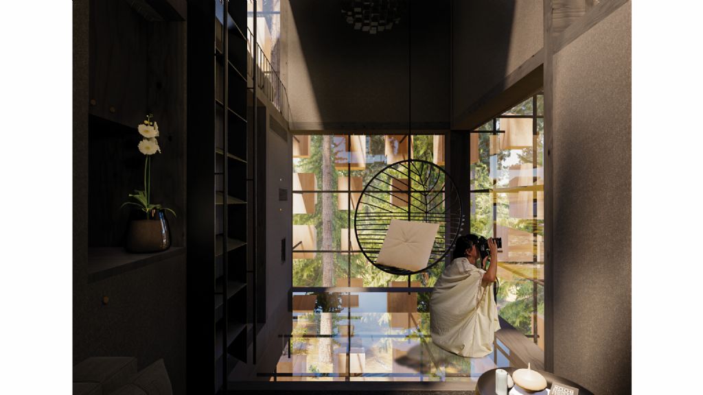 In de open kamer heerst er een bepaalde eenvoud, die een scala aan ervaringen mogelijk maakt in een relatief kleine ruimte. Door de individuele afmetingen van de vogelnesten te variëren en ze naar buiten uit te breiden, kan licht de binnenruimte binnendringen zonder het uitzicht naar buiten te belemmeren. De nieuwe hotelkamer werd in een ecologische habitat verwerkt, waardoor de gasten de kans krijgen om de vogels van dichtbij te observeren en zich in het epicentrum van de natuur te bevinden. Bezoekers hebben toegang tot een dakterras – dicht bij de boomkruinen – dat een uitzicht van 350 graden op het bos biedt.