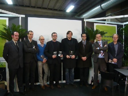 Groepsfoto van een aantal winnaars en juryleden. Van links naar rechts Vincent Van Landuyt (PMG), Tom Thys, Tomas Ooms (RDBM), Sven Goedefroo, Damiaan Vanhoutte, Lieven Pieters (DUCO), Rik Neven (Vlaamsearchitectuur.be / Redactiebureau Palindroom) en Jef Marinus (FEBE)