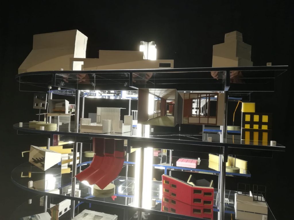 In een eerste ruimte staan zeven zogenaamde montagelandschappen, taferelen vol thematisch verwante realisaties, die bijna in origamistijl verzameld worden in een fictieve setting: architectuur en patchwork als filmdecor. In een laatste ruimte staan dan weer hel verlichte rekken, waarop à la Joseph Beuys studiemakettes van weer andere realisaties ruw gerangschikt worden: ontschaalde architectuur als sculpturen. Telkens mooi om naar te kijken maar echt veel wijzer wordt een bezoeker hier niet van omdat het theater het toneelstuk overstemt, omdat het verhaal spielerei wordt.