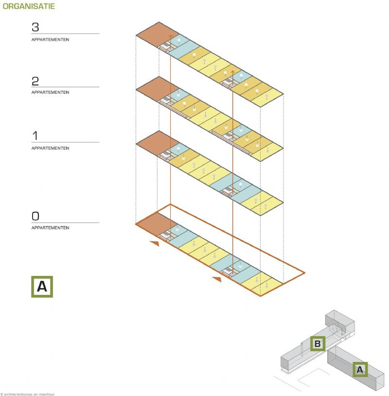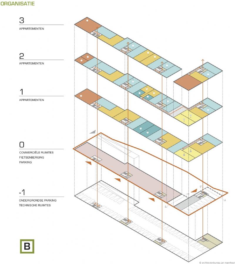 De wooneenheden zijn grondgebonden of toegankelijk via een beperkt aantal circulatiekernen en passerellen. Er is een grote mix in woontypes waarbij grootste types zich op de hoeken bevinden. Overige woningen genieten van doorzonprincipe. Gebouw B wordt voorzien van een commerciële sokkel, licht teruggetrokken, met maximale transparantie waardoor deze extra gearticuleerd wordt. De passerelle op niveau 2 van gebouw B vloeit over in een ontmoetingsplaats voor de bewoners en wordt meer dan een brug die de wooneenheden verbindt. Ze verbindt de bewoners.