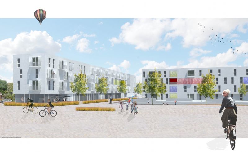 Het project streeft naar stedelijke integratie waarbij sociale interactie naadloos samenwerkt met individuele privacy. Dit zowel voor bewoners als omwonenden. De visuele entiteit van de witte blokken ent zich naadloos in het omliggende weefsel. 64 wooneenheden zullen worden opgetrokken in 2 witte blokken van 4 bouwlagen. Enkele kleuraccenten geven de blokken een persoonlijke uitstraling. De blokken articuleren de grenzen van het plein, terwijl doorsteken zorgen voor een connectie tussen het plein en de omliggende buurt. Het plein is enkel toegankelijk voor voetgangers en fietsers. Auto’s verdwijnen in een ondergrondse parking bereikbaar vanaf de rand van het plein.