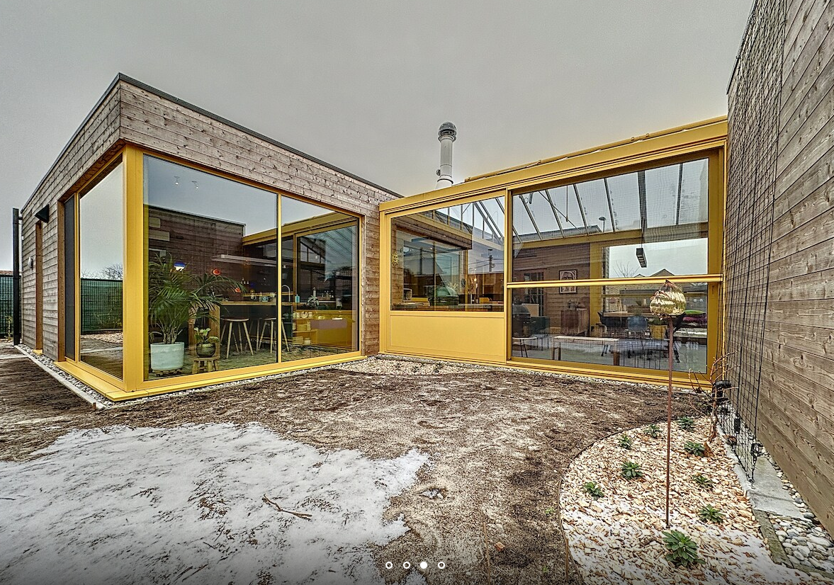 Het resultaat? Een woning met een structuur van gerecupereerd hout – de hoofddraagbalken en de randbalk van het dak zijn gelamelleerde balken van 420x90 mm, de dragende buitenwanden bestaan uit houten planken van 220x35 mm, buitenmuurisolatie van gebruikte rotswol, gerecupereerde sandwichpanelen als platdakisolatie, verschillende tweedehands binnendeuren, eerder gebruikte plafondpanelen van Heraklith en een gerecupereerd raam – in de berging. Die materialen, waarvan de meeste ook (deels) biogebaseerd zijn, werden gevonden in de materialenbank van Trovo.