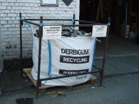 Voor het verzamelen van snijafval stelt Derbigum speciale “Derbigum-Recycling” big bags ter beschikking. Dakdekkers kunnen hun bitumineus snijafval ongeacht het merk gratis deponeren bij bouwhandelaren en dakspecialisten in de buurt. Een primeur in België en de omringende landen. Momenteel zijn er 150 inzamelpunten in België. Het inzameltraject voor het snijafval via de distributiesector mag een succes genoemd worden: dankzij het engagement van zowel de deelnemende bouwmaterialenhandelaren als dat van de dakdekkers wordt jaarlijks in Vlaanderen en Wallonië alleen al meer dan 350 ton kwalitatief hoogwaardig snijafval ingezameld.