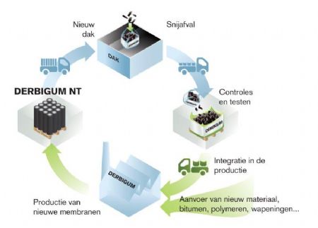 Derbigum stelt dat het op het vlak van recyclage al jaren een pioniersrol speelt met een uniek systeem voor recyclage van snij-en dakafval. Het is de enige Belgische producent die roofingafval rechtstreeks in het productieproces kan integreren en op deze manier het sluiten van de kringloop in de praktijk omzet : het unieke, gepatenteerde systeem behandelt en herwerkt oude bitumineuze dakdichtingsmaterialen tot nieuwe grondstof, die dan opnieuw gebruikt kan worden voor de productie van milieuvriendelijke dakbedekking. Vandaag is al meer dan een kwart van de grondstoffen gerecycleerd bitumen, goed voor bijna 4.000 ton per jaar. De ambitie reikt echter verder en voor 2020 is ‘zero impact’ als doelstelling gezet.