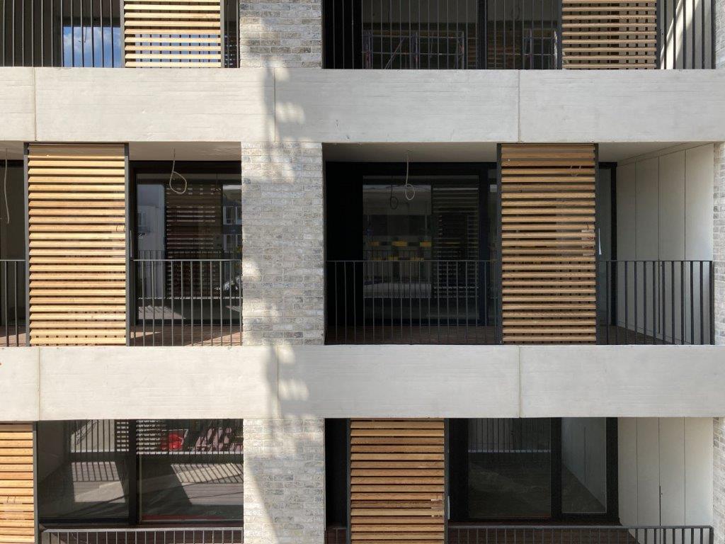 “Het was de bedoeling om architecturale eenheidsworst te vermijden en esthetische variatie te creëren, zij het zonder de visuele coherentie van het totaalplaatje uit het oog te verliezen”, vertelt Wiert Gerats, projectarchitect bij Abscis Architecten, dat instond voor het ontwerp van de stadsappartementen langs de Meldertstraat (aansluitend op de ‘Witte Kazerne’) en dat ook de algemene projectcoördinatie voor zijn rekening nam. “Iedereen heeft zijn creatief ei kunnen leggen – inclusief eigen accenten en detailleringen – maar de materiaalkeuze, de kleuren en de algemene uitstraling liggen in dezelfde lijn, met lichte tinten, baksteen en beton als rode draad. Daarnaast moesten we er uiteraard ook voor zorgen dat de nieuwbouwvolumes mooi aansloten bij de bestaande historische gebouwen. We hebben samen met de dienst Stedenbouw nauwgezet toegezien op de bouwhoogtes en -densiteit, zodat het geheel zeker niet te ‘zwaar’ zou ogen of visueel uit balans zou raken. Ik denk dat we mogen stellen dat dit uitstekend gelukt is. Ook de manier waarop het rustgevende groene binnengebied erin verweven is – inclusief vier sfeervolle doorsteken naar het omringende stadscentrum – draagt hier zeker toe bij.”