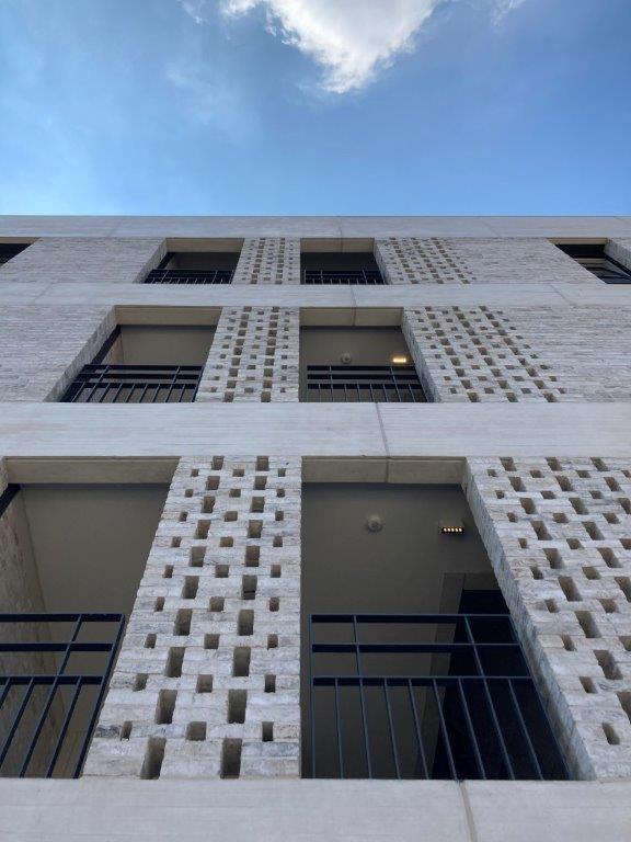 Ondanks hun gemeenschappelijke karakteristieken hebben de drie nieuwbouwvolumes een eigen uitstraling en identiteit. Ook hun bouwprogramma is erg divers, met een ruime variëteit aan appartementstypes en oppervlaktes. Gebouw A (ontworpen door Abscis Architecten) is voorbehouden voor doorzonappartementen die sterk geënt zijn op het groene binnengebied. “We hebben geopteerd voor een ‘rechttoe-rechtaangebouw’, waarbij de gesloten geveldelen in lichtgrijze beton en genuanceerd metselwerk worden afgewisseld met ruime inpandige terrassen (aan de achterzijde) en ritmische verticale raampartijen (aan de voorzijde). Een belangrijk uitgangspunt was dat we de doorzichten van de Meldertstraat naar de binnentuin wilden accentueren. Vandaar dat de traphallen meteen ook zijn opgevat als buitenruimtes, inclusief identieke gevelbekleding, kasseibestrating, aluminium inkomdeuren enzovoort. Deze buitenruimtes fungeren als tussenzones waar contacten tussen de bewoners onderling en met voorbijgangers ontstaan. Dit draagt bij tot de sociale verbondenheid, interactie en controle”, legt Wiert Gerats uit.