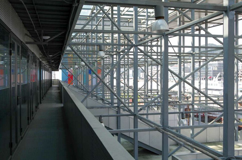 Doorlopende balkons sieren de gevels, zodat ze in de zomer volledig geopend kunnen worden. Dit maakt dat het gebouw eruitziet als een stapeling van grote terrassen. Het ingangsmonument, een kleurrijk verticaal prisma, biedt plaats aan 42 auto's of extra horecaruimtes met zicht op de haven.